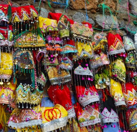 Per festes puntuals fan servir aquest mocador que està molt decorat i que es posa per emmarcar el rostre i embellir-lo.