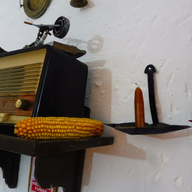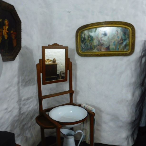 Des de ja fa uns quants anys aquestes parets que resultaven tan rústegues s’emblanquinen, cosa que dóna un aire polit i endreçat al conjunt. Una habitació amb ornaments i un moble destinat a la neteja personal.