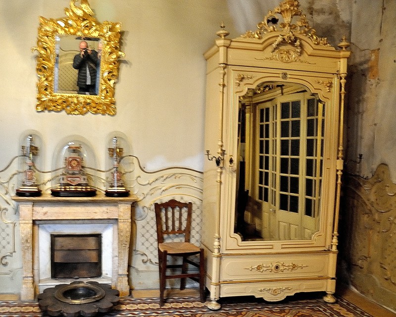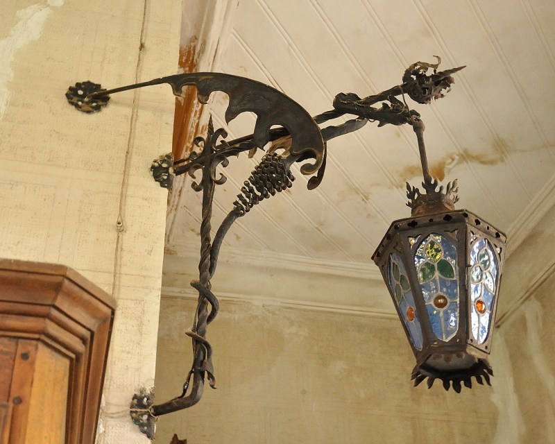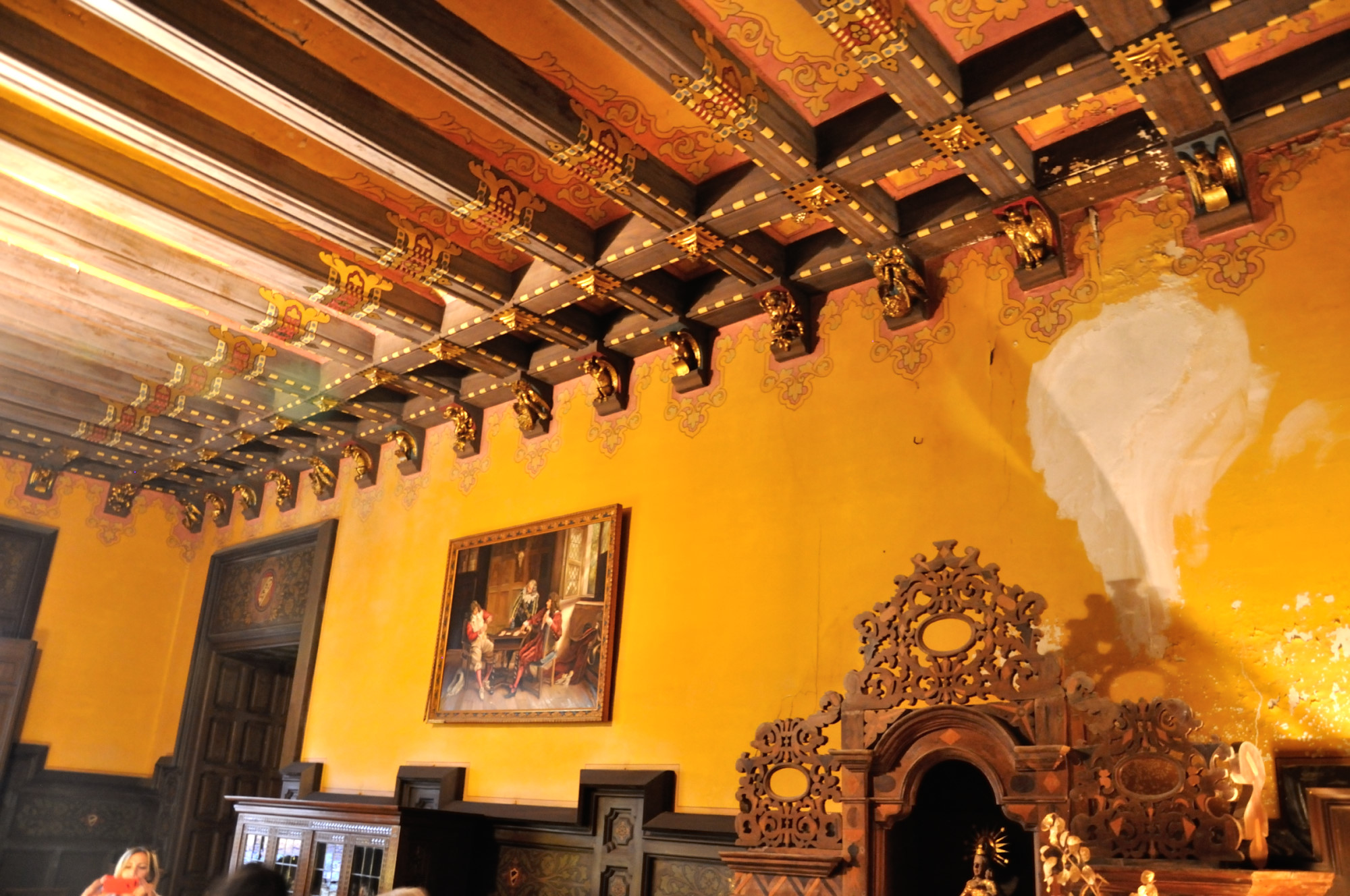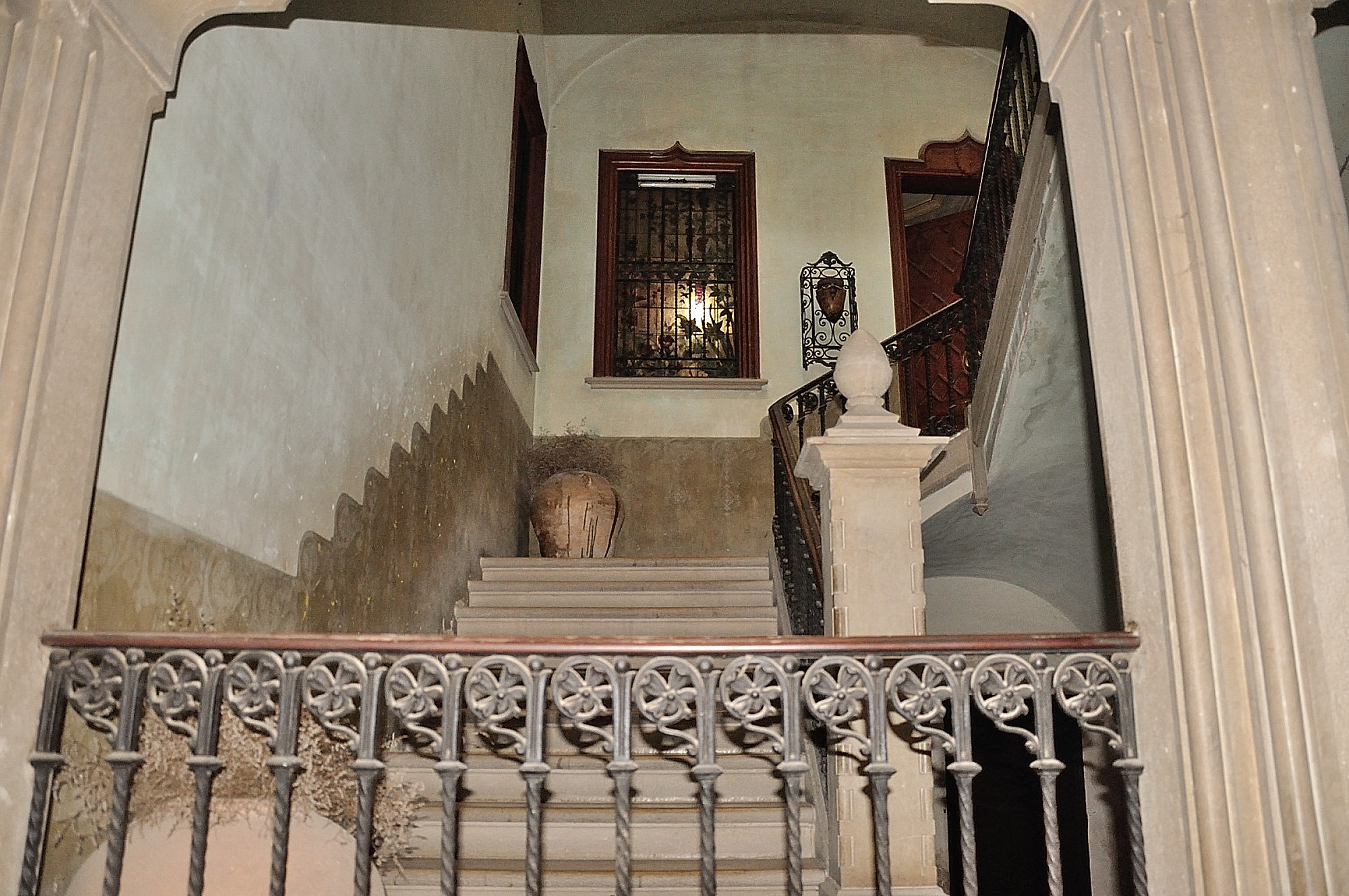 Els sostres tenen un ric treball de decoració. una fuita d’aigua del pis de dal ha malmés alguns fragments.