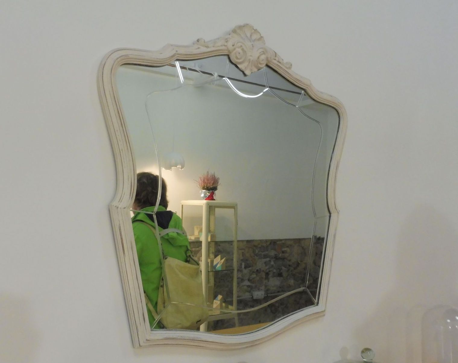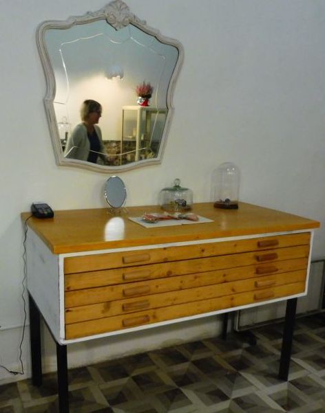 A continuació, un mirall amb el mateix acabat de les cadires, està col·locat al damunt d’un moble amb molts calaixos per guardar joies. Permet veure com queden peces que algú es vulgui posar: arracades, collarets…