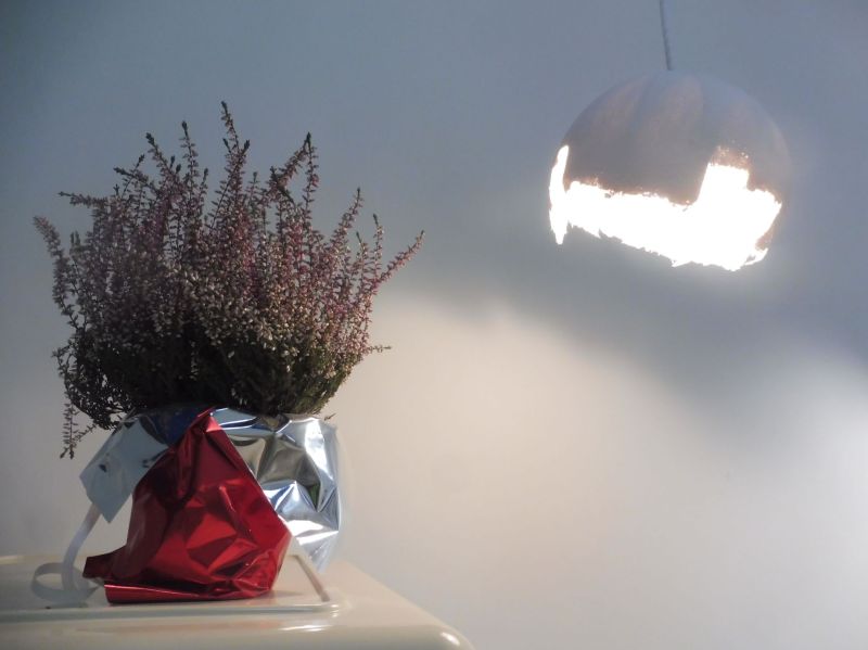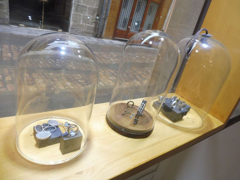 Al costat d’aquest bonic centre floral, que reposa damunt un vitrina que ens recorda les dels antics hospitals, s’hi veu un dels quatre llums que il·luminen els expositors que hi ha a l’altra paret. Atenció a aquestes lampàdes perquè són molt originals i gens vistes. A la imatge no es veu prou bé l’encertat disseny.