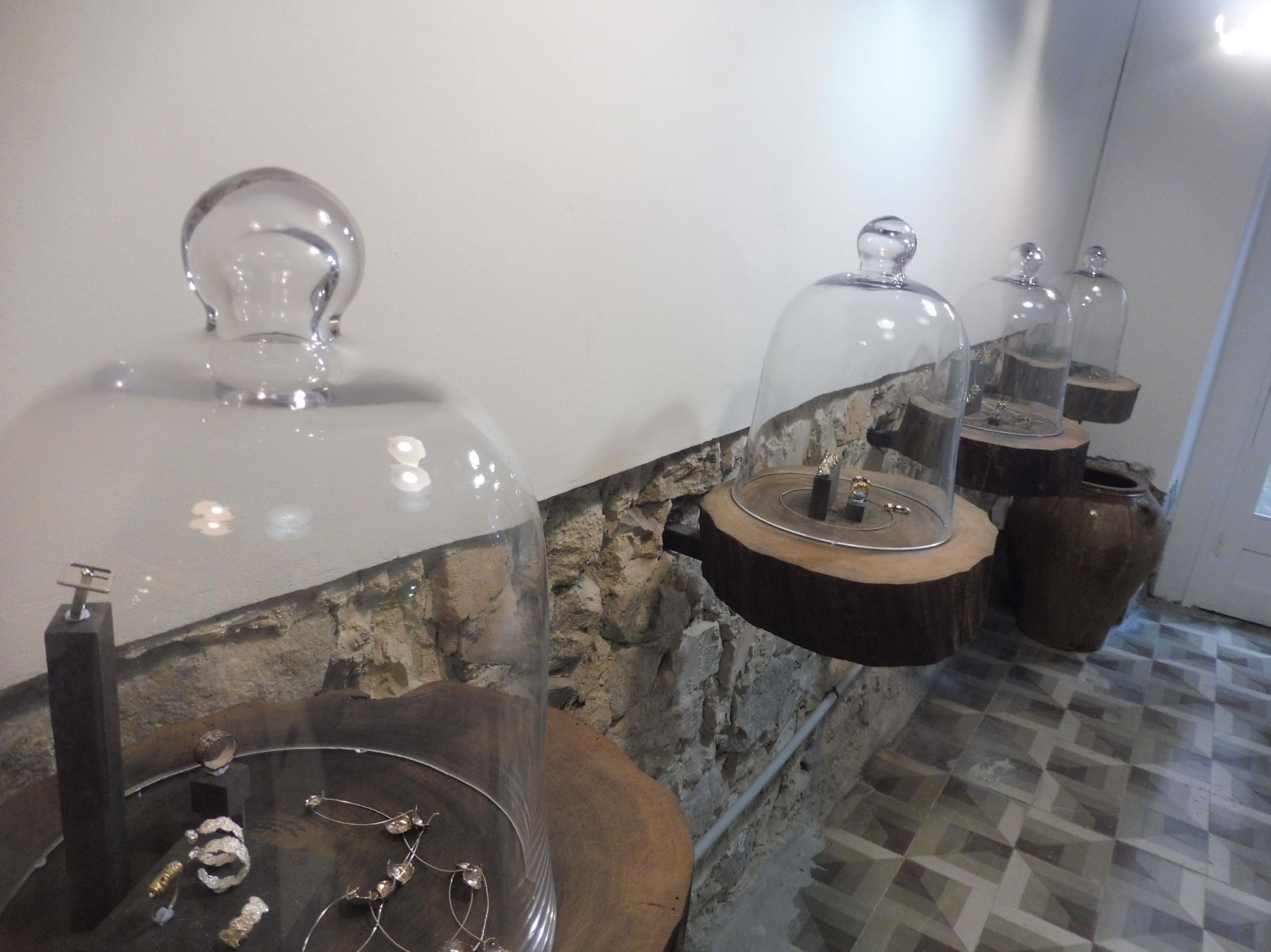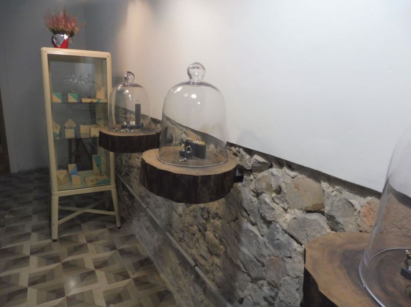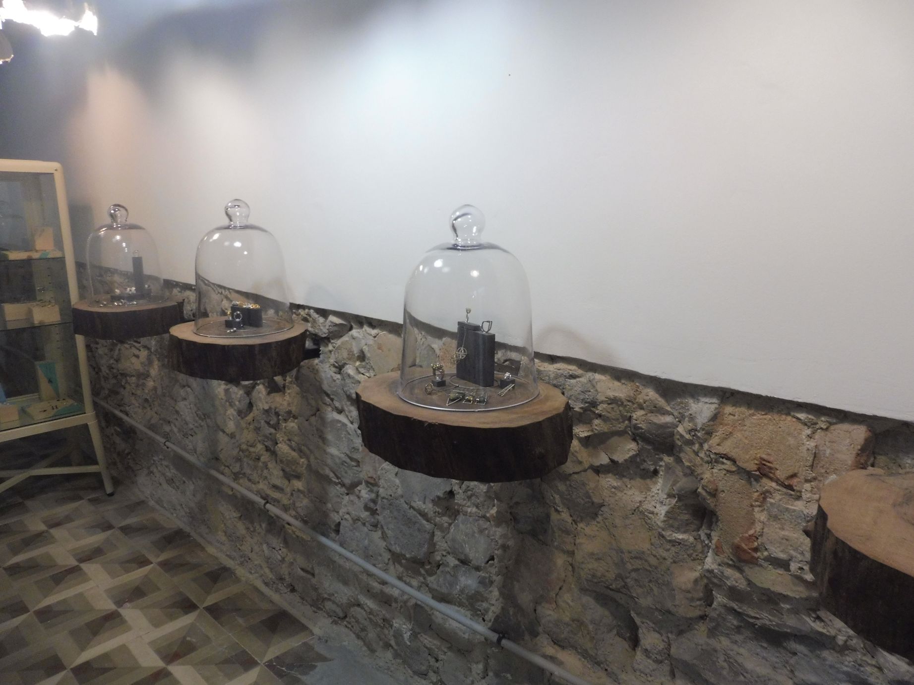 Una part de la paret s’ha deixat amb la pedra vista. Els expositors estan col·locats damunt un fragment d’un tronc d’arbre que vola lliure amb el suport d’un ferro clavat a la paret. El contrast amb la pedra, la fusta i el vidre resulta ideal.