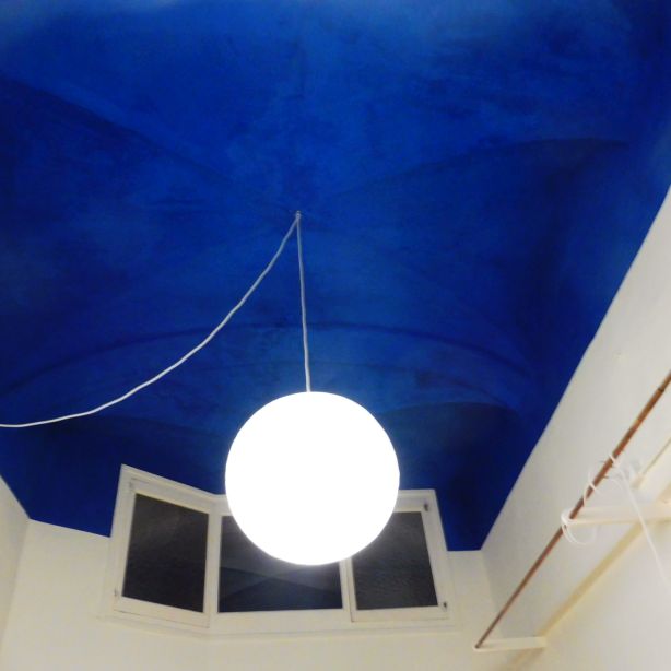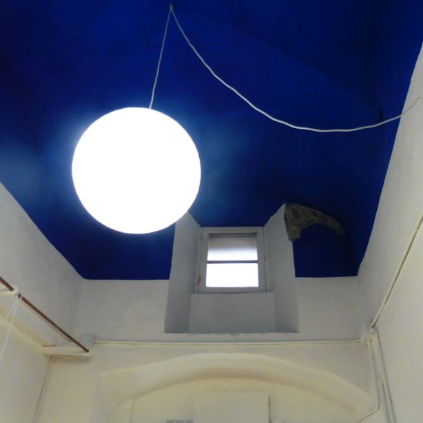 A l’altra banda s’hi pot veure la finestra que dóna al carrer Major. Un parell de globus de paper pengen d’aquest cel, i semben dues llunes il·luminades. Tot plegat queda molt bé.