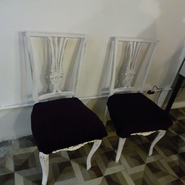 Un parell de cadires amb acabat decapat descansen damunt de les rajoles hidràuliques originals.
