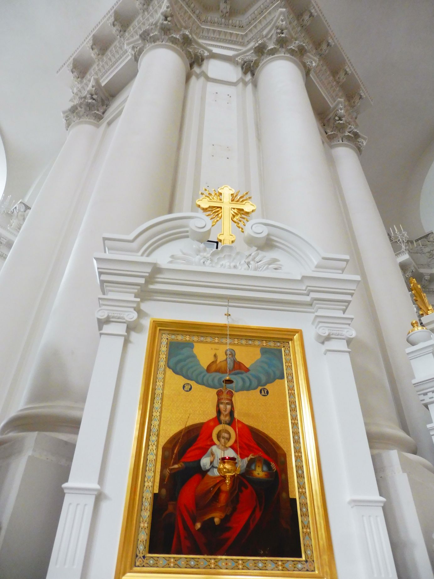 Les icones i els daurats destaquen damunt la blancor de les parets. Actualment està oberta al culte. També es fa servir com a sala de concerts.