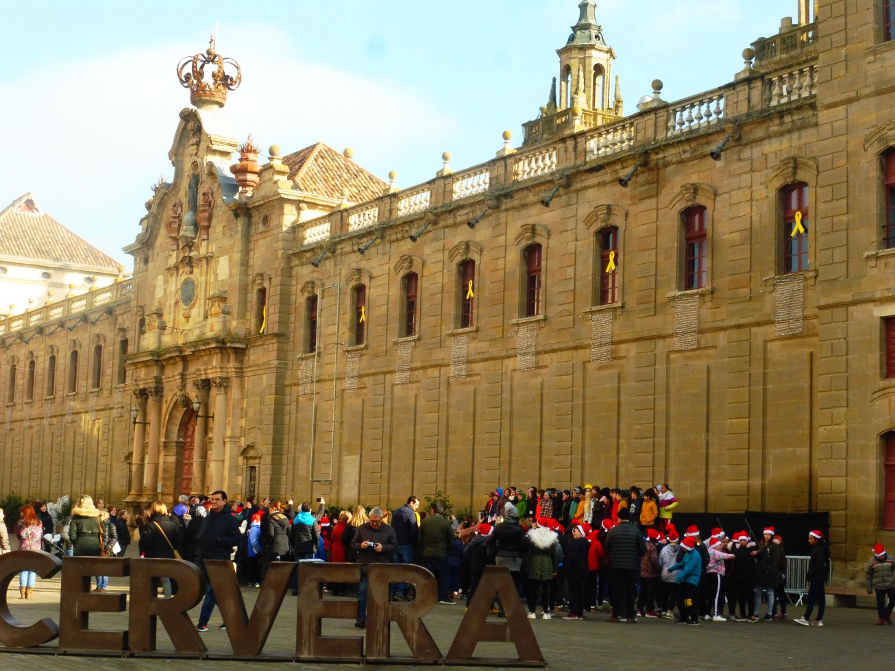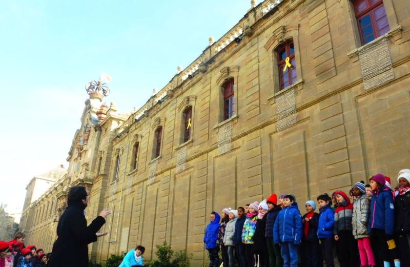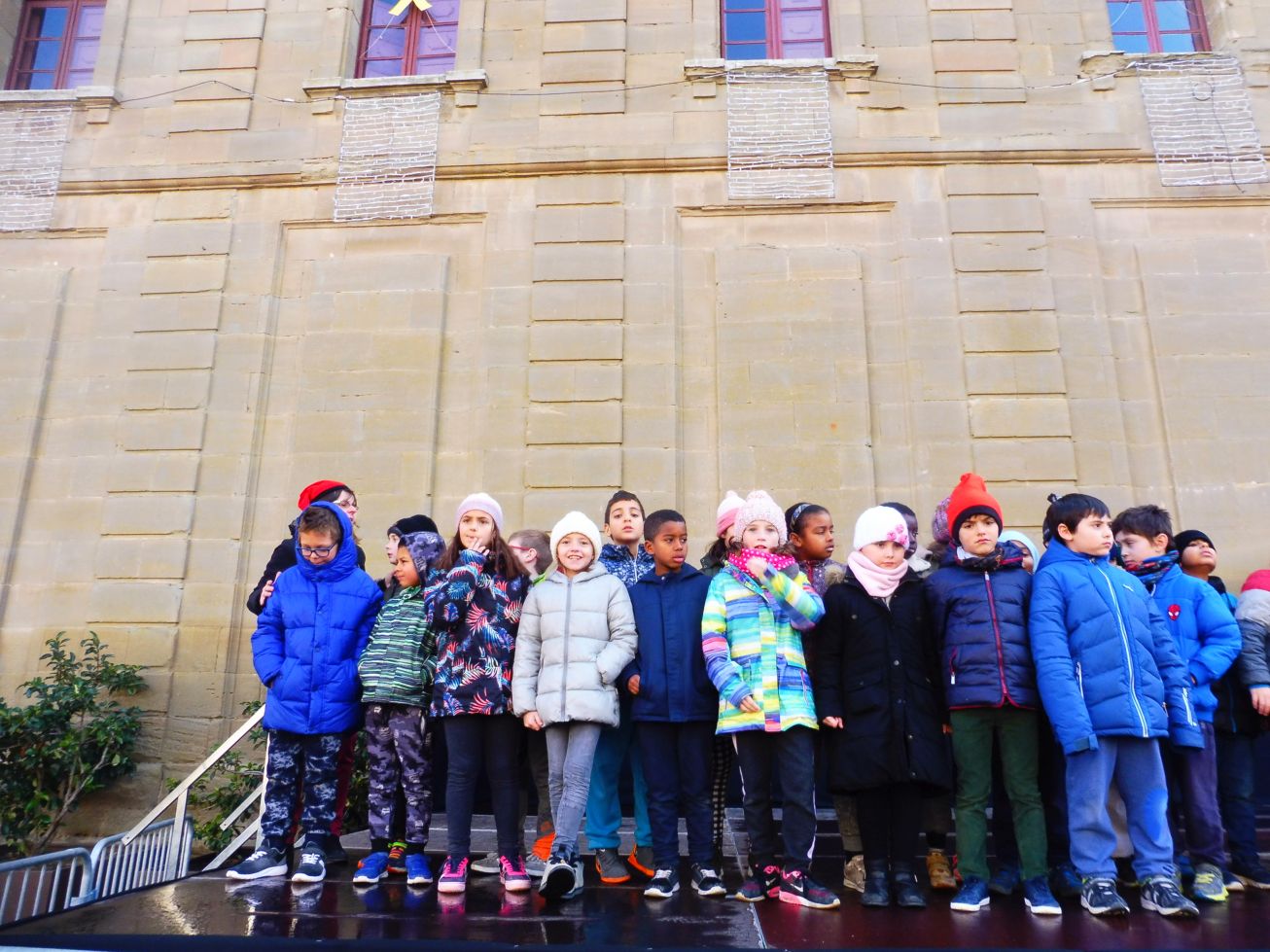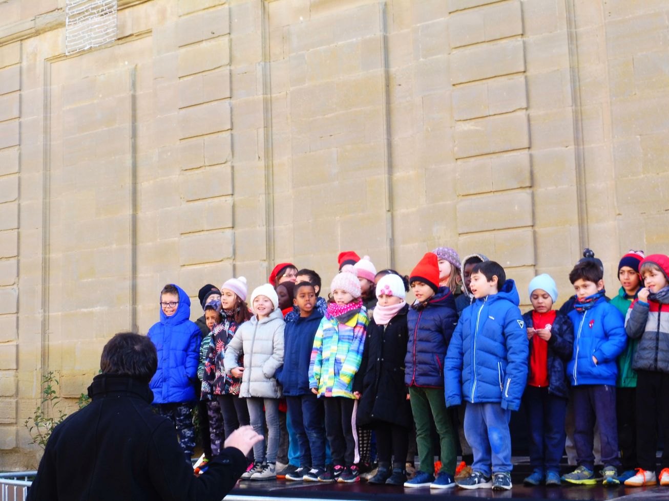 Els més grans ja s’han col·locat a la terrassa del Casal per cloure amb les seves nadales la interpretació d’enguany. Des de la plaça, la resta d’alumnes i demés persones que els escolten, els miren com si estessin dalt d’un escenari.