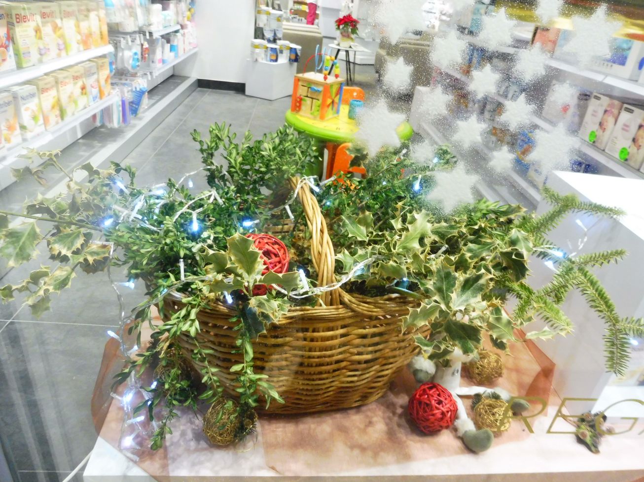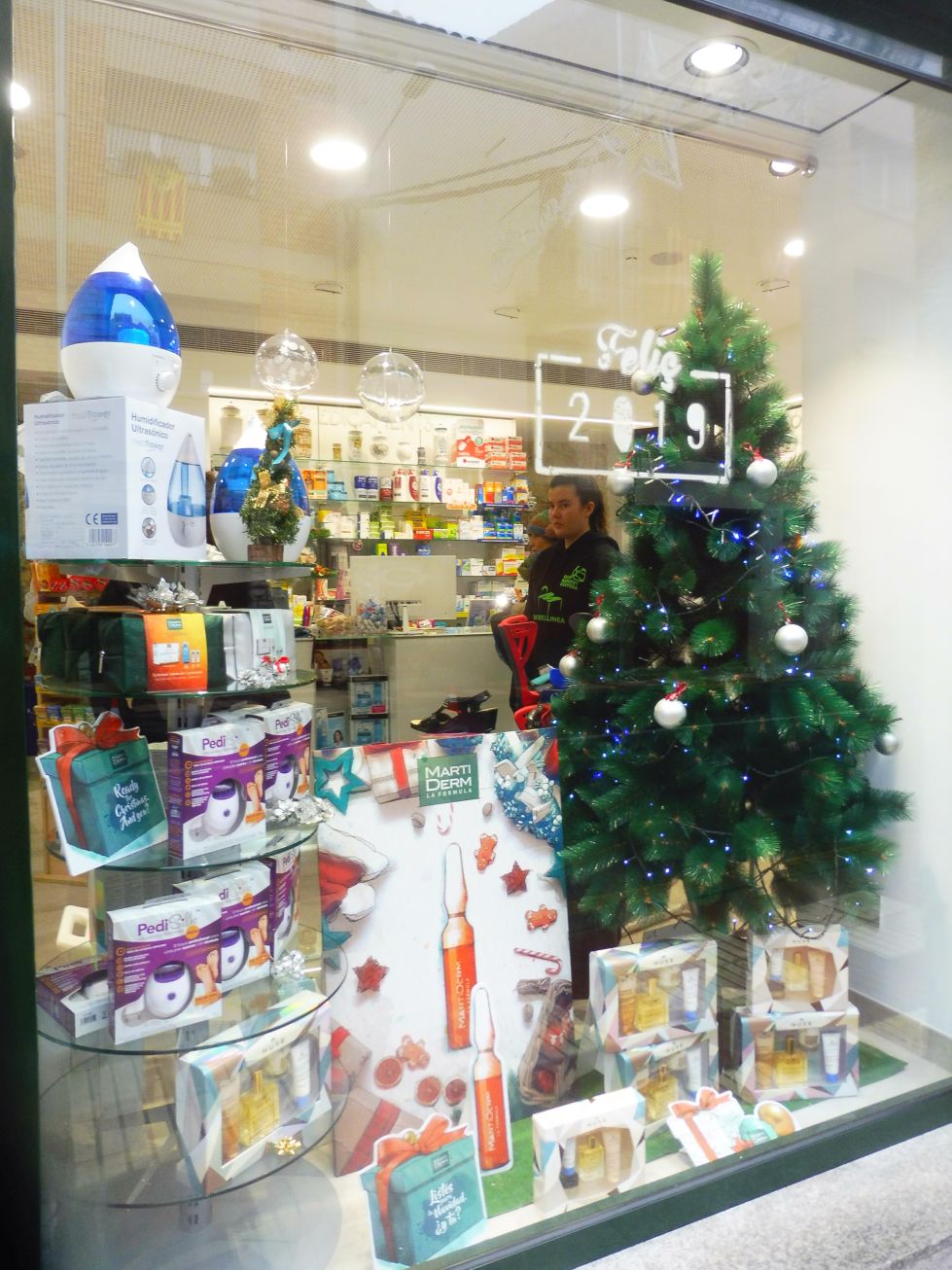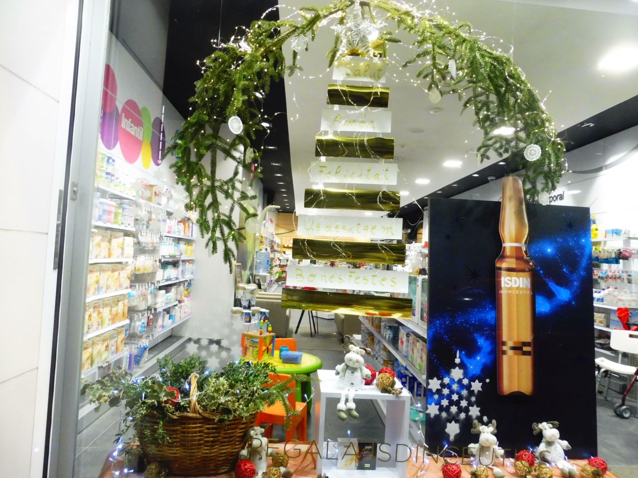 Farmàcia Antonijoan ha decorat l’aparador amb una espectacular composició nadalenca. Un original arbre amb daurats…