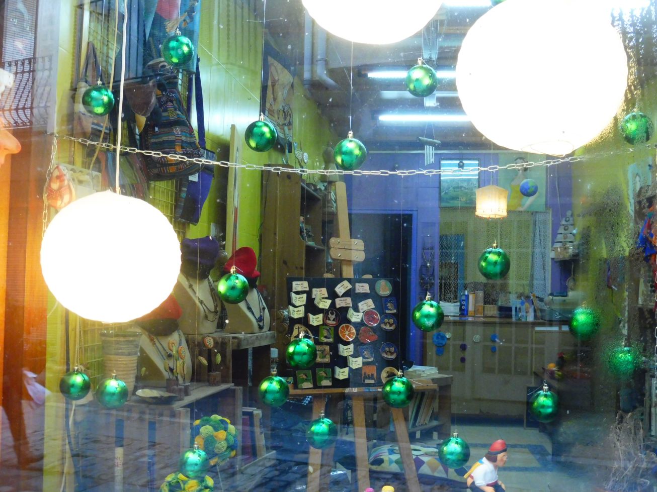 L Les voltes, una pluja de boles verdes omple el fons d’un aparador ple de boics objectes artesanals.