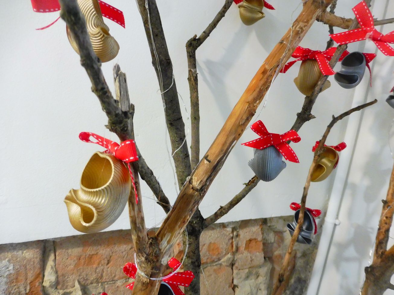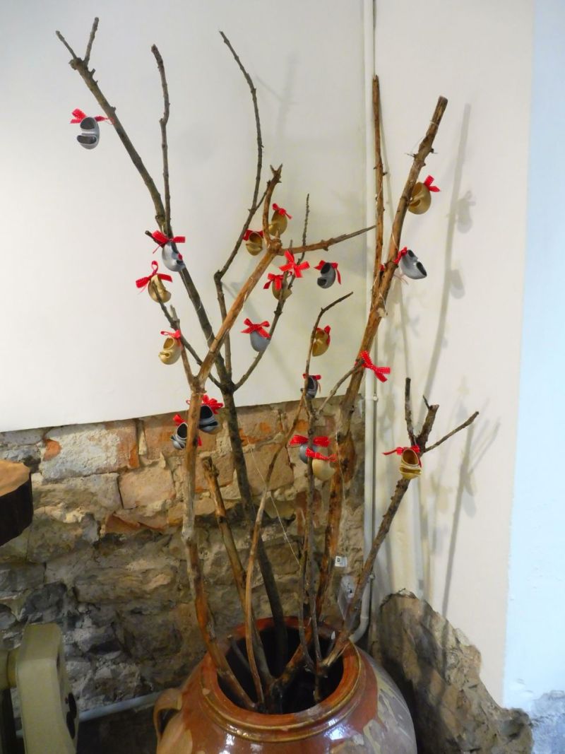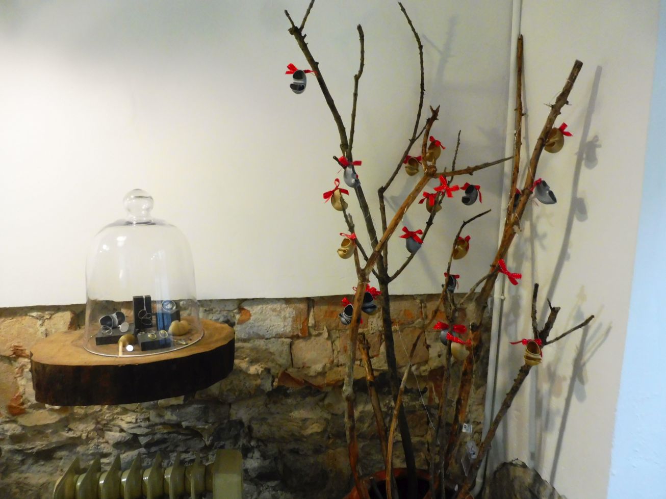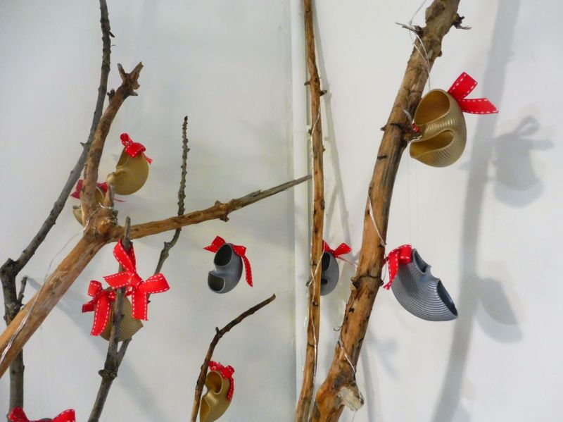 La idea del vidre dóna continuïtat als recipients que fan d’expositors a la botiga. L’arbre s’ha fet amb uns quants troncs dels que hi pengen, també lligades amb un llacet vermell, els galets.