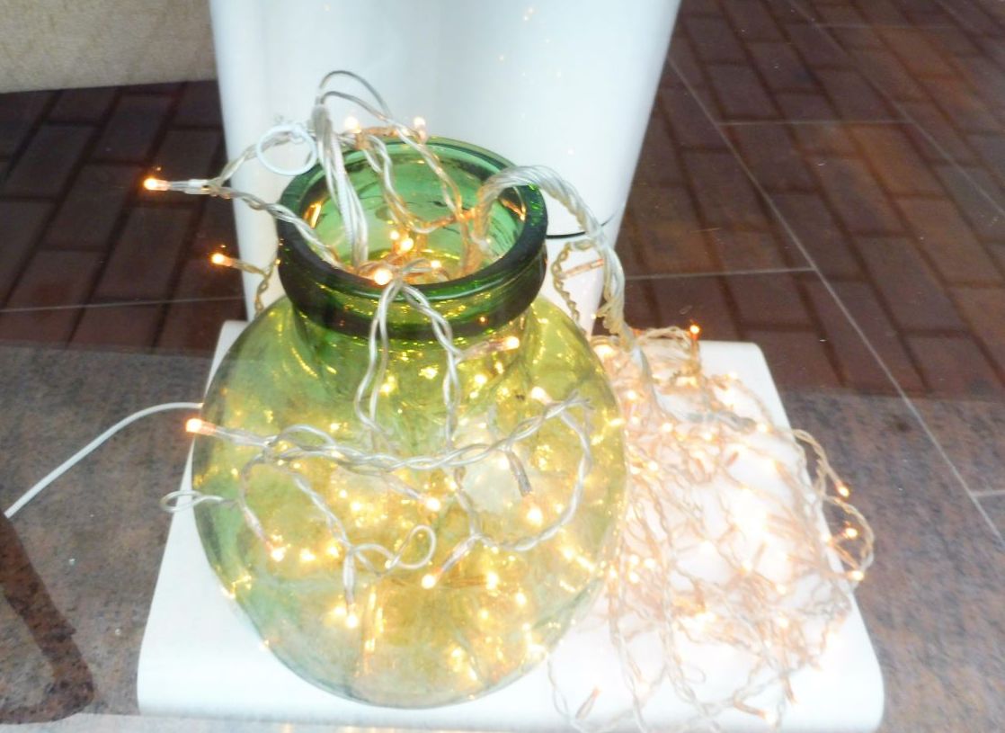 Seguim encara al centre de Cervera i ens trobem amb una idea molt bona i fàcil de copiar. A la Perruqieria Baró s’hi troba un recipient de vidre de color verd, dels que normalment servien per guardar l’oli, i se l’omple amb un regitzell de llumetes de manera que queda molt decoratiu.