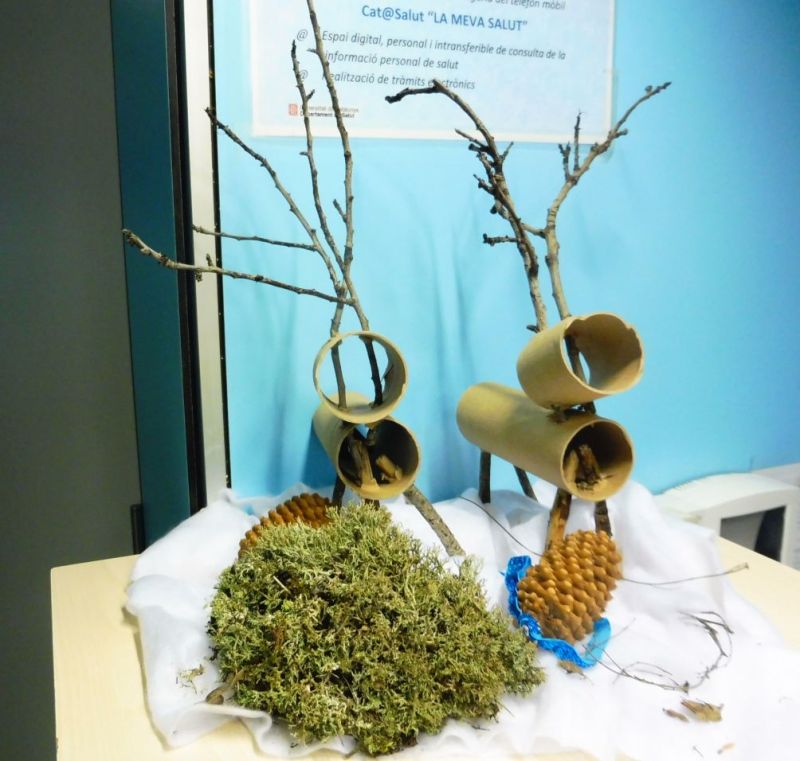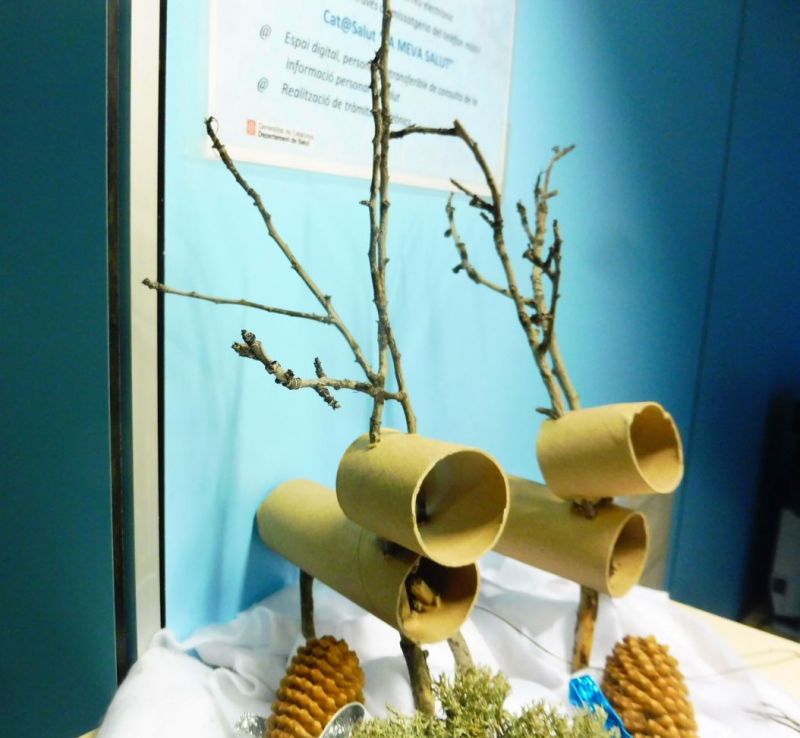 El blog tanca aquests seguit de pocs amb uns elements molt bonics que es troben al CAP de Cervera. aquests a la zona d’urgències. Com podeu veure són molt enginios. Amb dos tubs u unes branques representen una parella de cèrvols. Un treball fàcil i que resulta entranyable. Amb pinyes han complementat la decoració.