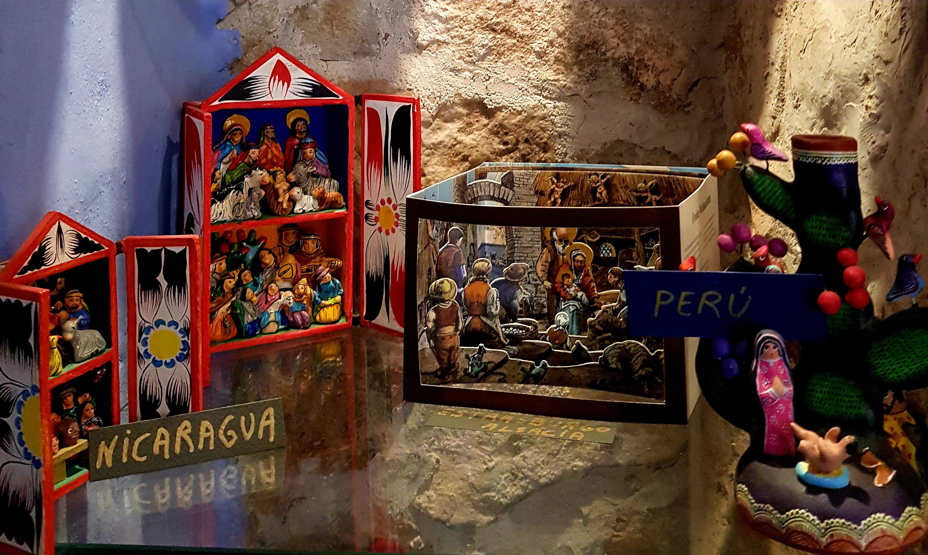 Fa nou anys que s’havia fet una exposició en aquest mateix espai amb alguns d’aquests pessebres. Els que portaven el nom de procedència escrit damunt la caertolina blava eren els que ja s’havien vist en la primera mostra. Els de la cartolina grisa formaven part de l’ampli nombre de pessebres exposats per primera vegada.