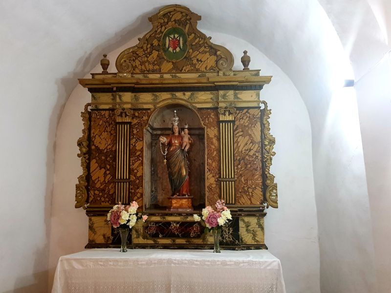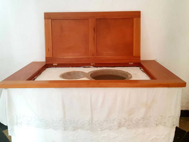 Molt curiosa la pica de batejar. D’una simplicitat total queda amagada al ulls quan la tapa resta tancada. Unes estovalles de lli amb randes són l’únic ornament.