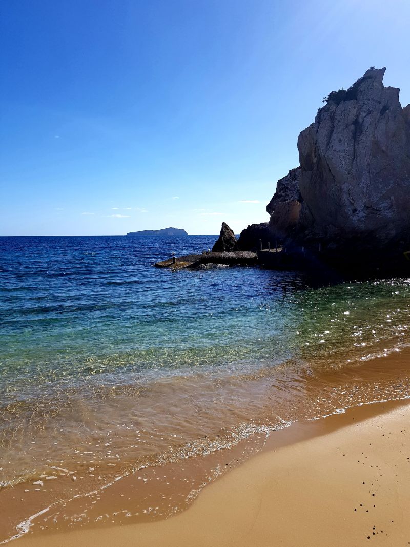 El mar sempre present en l’illa blanca. En aquest cas es tracta de l’última cala que és troba, per la part de l’est, al nord. És la cala de Sant Vicenç i està envoltada de molts edificis turístics, cosa que la fa diferent a la majoria de les cales eiveissenques en les que només s’hi troba com a molt un restaurant o un baret.