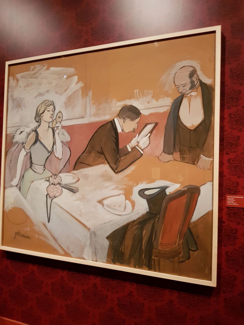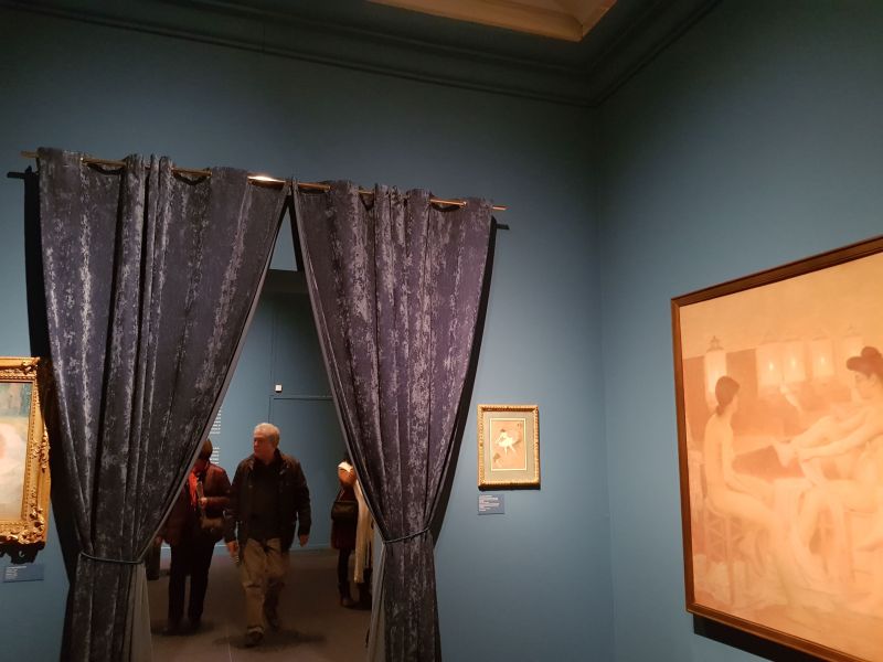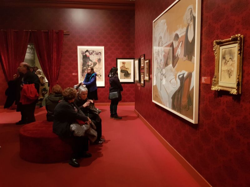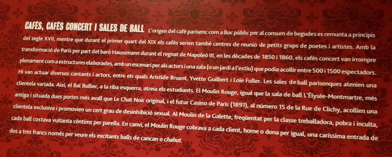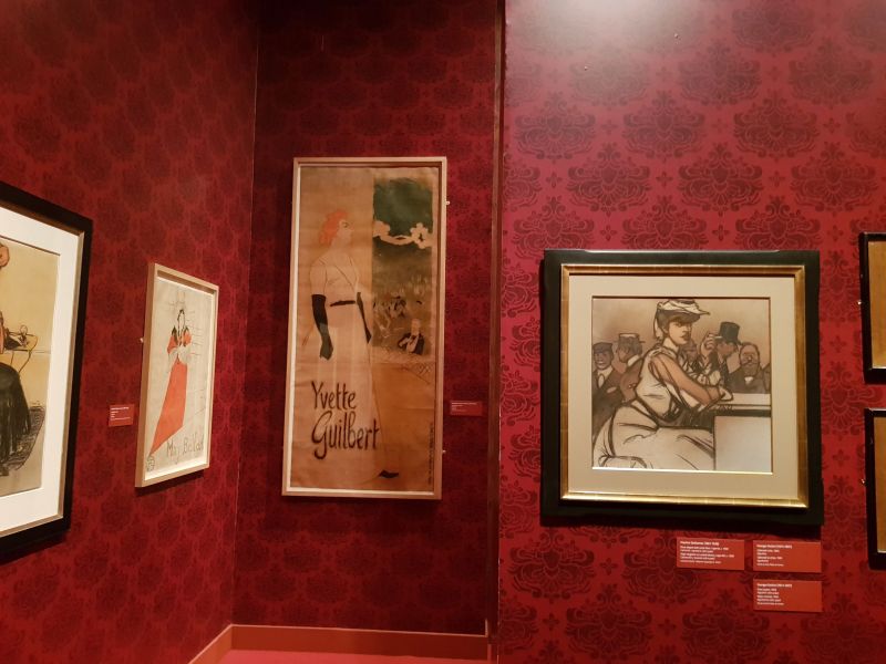 Aquesta part de l’exposició transcorre per unes parets entapissades d’un bonic color granatós a semblança dels cabarets de l’època. Del sostre hi pengen làmpades que semblen de cristall i s’escolta l’alegre música del can-can. Un ambient que et transporta en aquests locals del Paris de l’època.