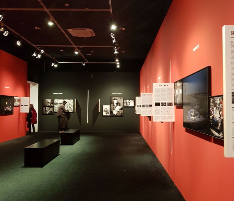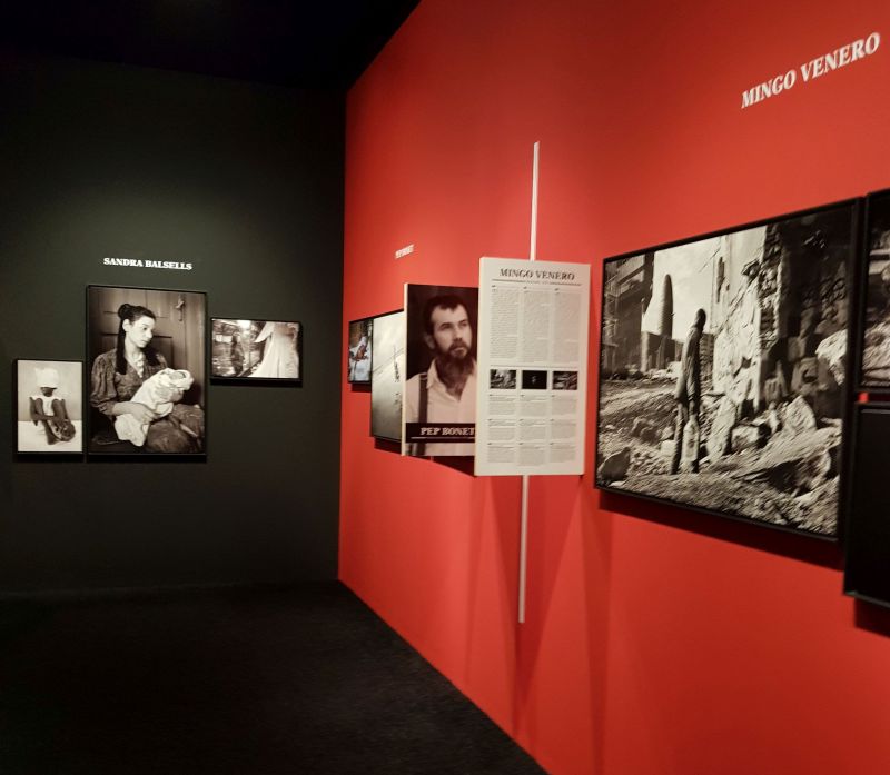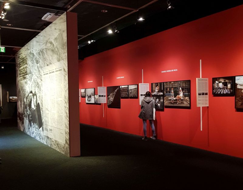 Diferents racons de l’espai. Com podeu veure, les imatges dels 40 periodistes queden separades per un cartell subjectat a la paret on s‘explica cadascuna de les fotografies. A la part superior s’hi pot veure, en blanc, el nom dels autors i autores.