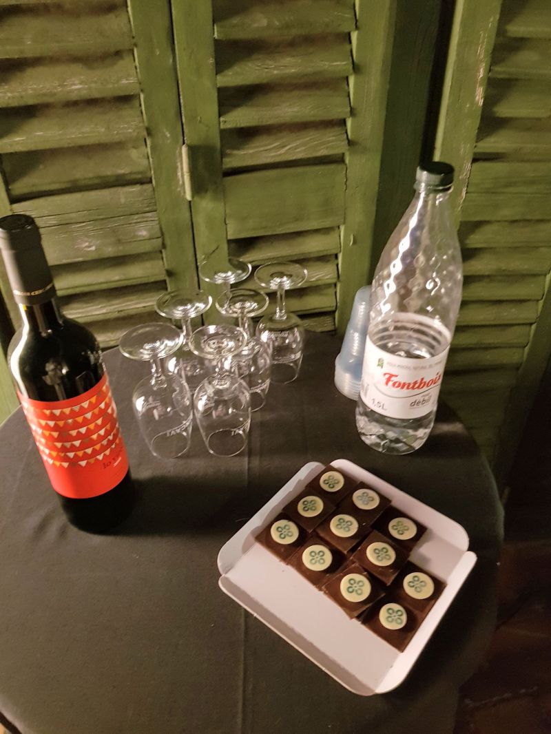 Al finalitzar la presentació, a la terrassa de la casa Duran,es va poder fer un tastet de vi acompanyat de xocolata. És una porció, com podeu veure en la fotografia, en la que hi ha dibuixat el disseny de les quatre c que fan el logo de Cervera Capital de la Cultura Catalana.