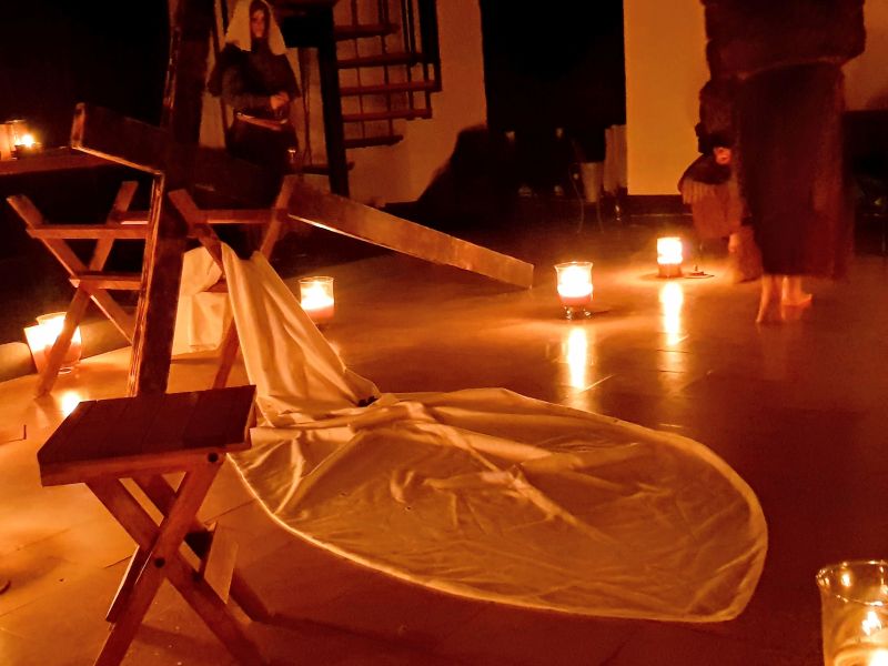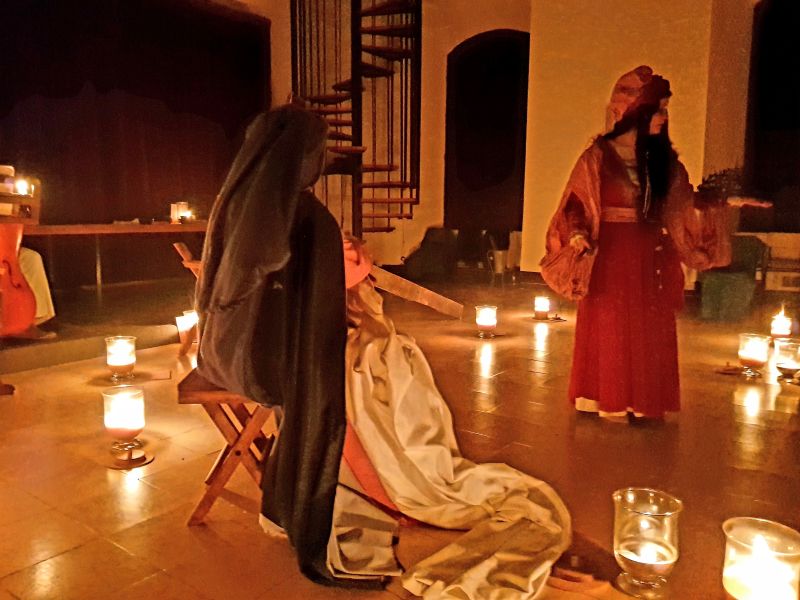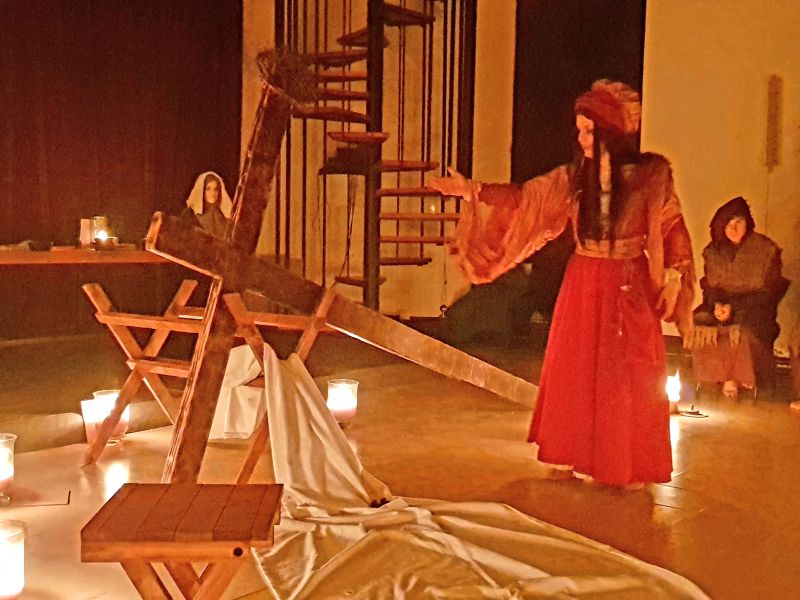Pel que fa a les Veus Silents hi vam poder veure quatre personatges femenis: Clàudia, la muller de Pilats que representa el coratge i la integritat en la lluita per la justícia; Verònica que acompanya Jesús en la crucifixió i que mira d’esmorteir el seu dolor, que representa la misericòrdia i la compassió.