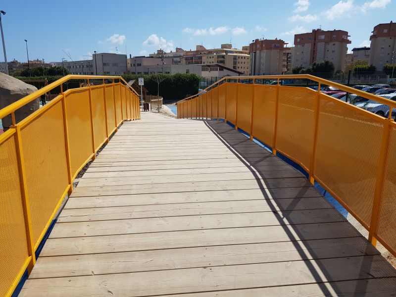 S’hi entra per un ampli pont amb una vistosa barana pintada de groc. Representa que es travessa un riu