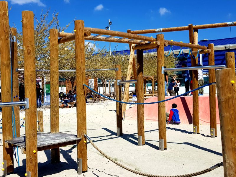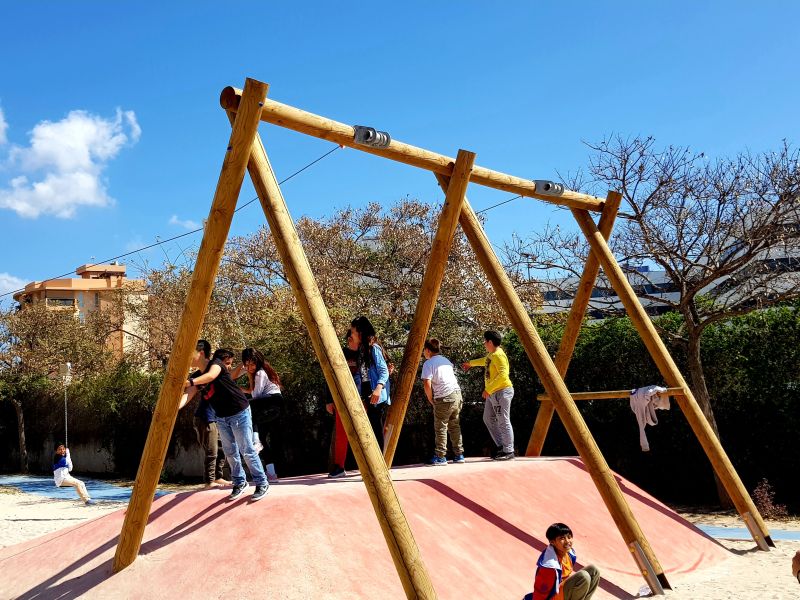 Aquí teniu l’estrella de la corona: una tirolínia. No n’havia vist mai en cap parc urbà i té un èxit impressionant. En fer aquest reportatge al parc hi havia un grup d’alumnes ja una mica esquerats que s’hi trobaven d’excursió. era cap al migdia i van venir per dinar i alhora jugar.