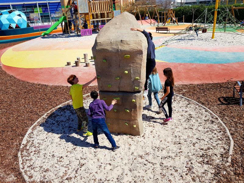 Un petit rocòdrom, ja que si fos més gran hauria d’estar vigilat per un adult, entreté els infants que volen provar les seves habilitats escaladores.