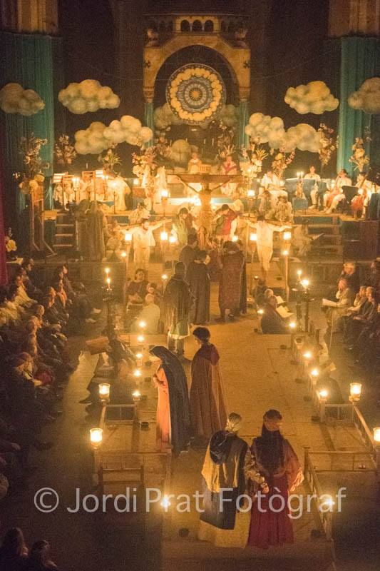La Passió Medieval de Cervera ha tornat a l’església de Santa Maria mantenint tres espais diferenciats: el Cel, l’Infern i la Terra. En aquest acte teatral i litúrgic, que es va estrenar l’any 2016, hi intervenen més de 150 persones, entre actors i actrius, tècnics i equip artístic. La representació d’enguany va tenir lloc el dia 6 d’abril.