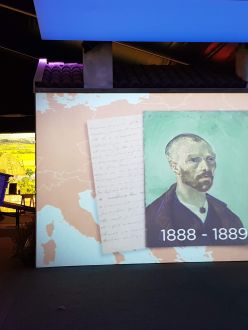 Passem a un dels altres grans espais d’aquesta mostra que es va poder veure la passada primavera a Barcelona. Un lloc ampli on els colors vius i les pinzellades potents n’eren els protagonistes. Hi seguia havent pantalles gegants en les que es projectaven les pintures de l’artista. Els girasols van ser, sovint, protagonistes de la seva obra. Aquest quadre és un dels més coneguts del pintor: l’interpretació que fa de la seva habitació. Colors contrastats i textures amb relleu són […]