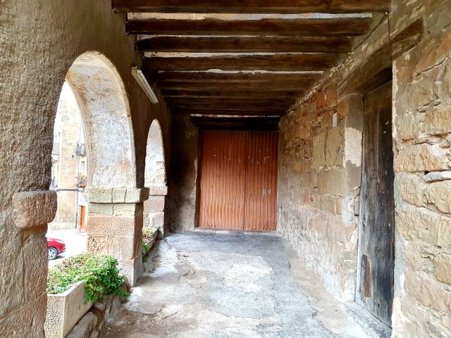 Seguim caminant i ens trobem, altra volta, amb aquests sostres embigats que són un element molt representatiu de l’arquitectura de Torà. Al fons, a mà esquerra, s’hi veu una balconada amb una barana de ferro, que crida l’atenció.