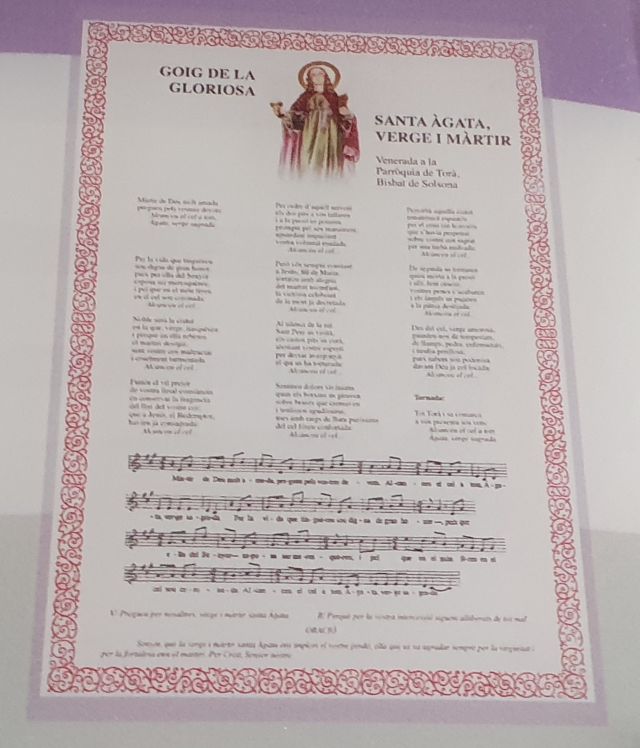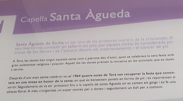 Santa Àgueda, és una figura que mereix especial atenció quan es parla de Torà, ja que aquí hi tenen una devoció especial. En aquest espai, sota una volta, s’hi troben una reproducció dels Goigs…