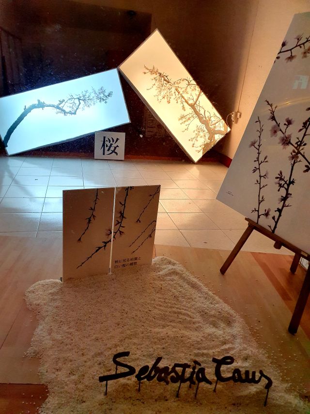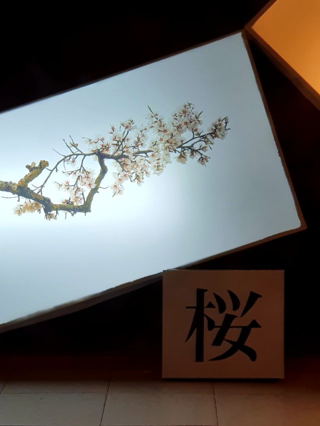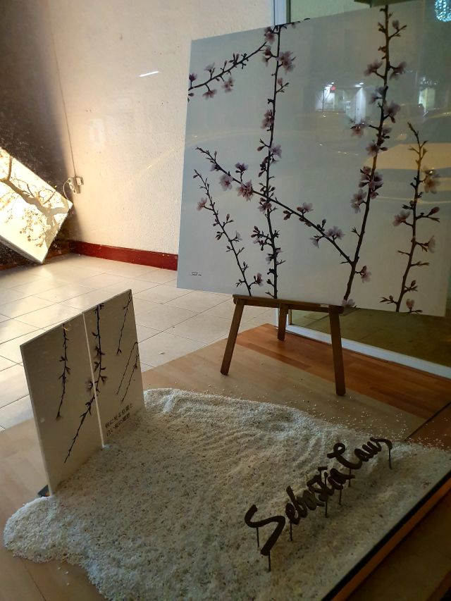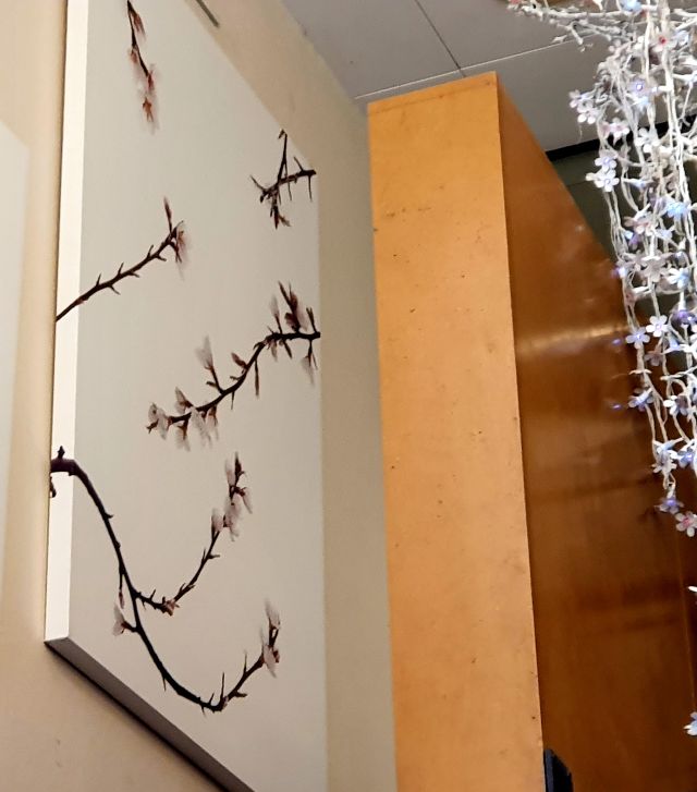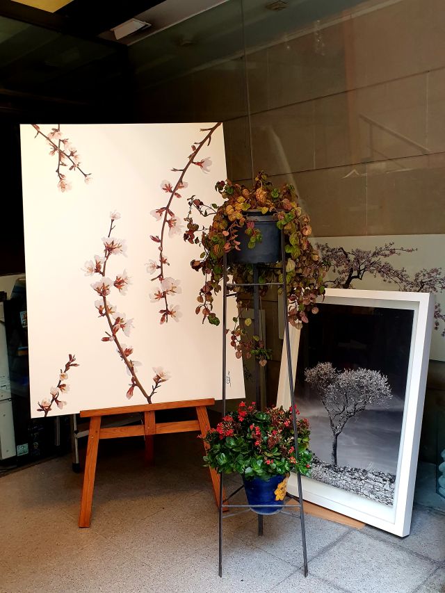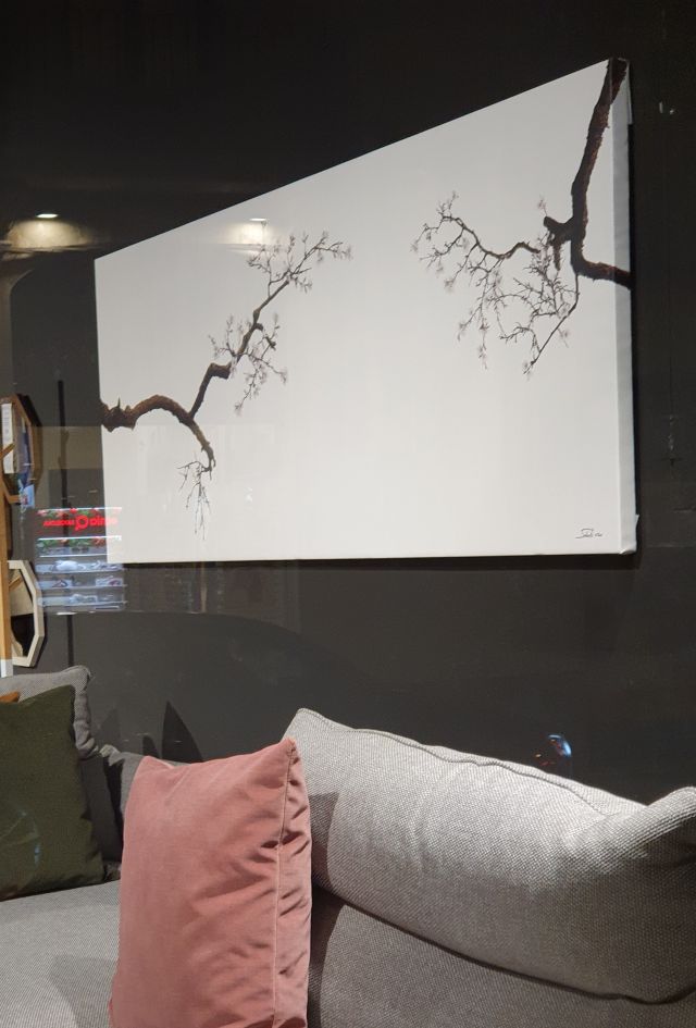 També en podem admirar alguna integrada a la decoració, a la botiga de mobiliari del carrer Victòria. Allí es veu com de bé hi queda la serenor i bellesa d’aquestes fotografies que tenen com a protagonistes les branques d’ametller.