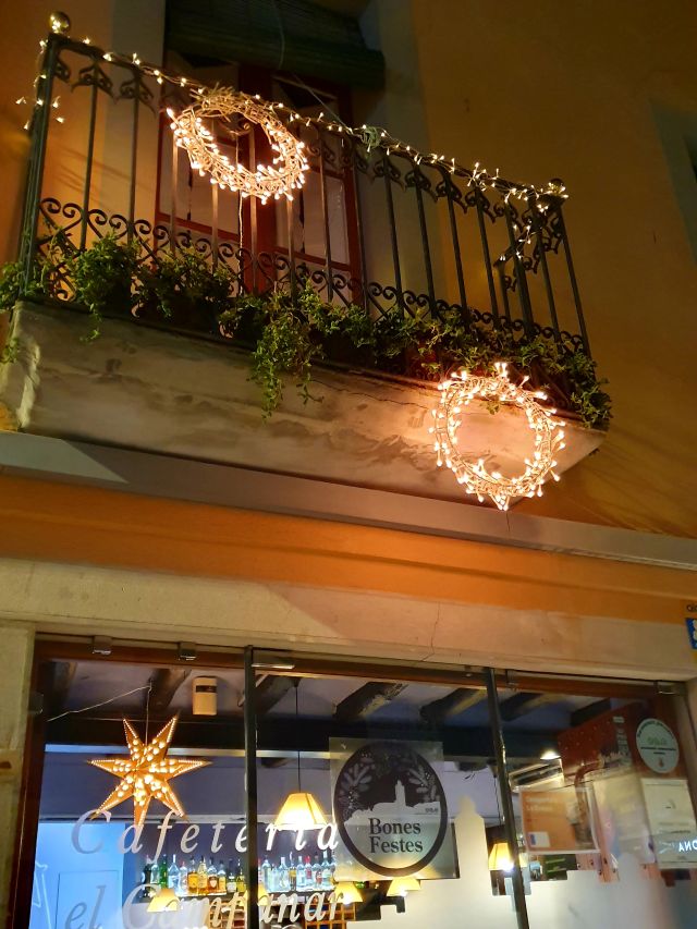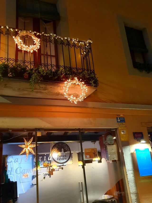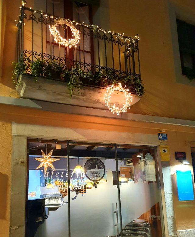 La Cafeteria el Campanar ha optat per decorar la part més visible, el carrer, i l’entrada al local. I ho ha fet emprant la llum que dóna vida i caliu en aquests temps tan foscos. Dia i nit han estat encesos aquests petits, però ben visibles punts de llum, que han aportat vivesa i càl·lidesa a la zona.