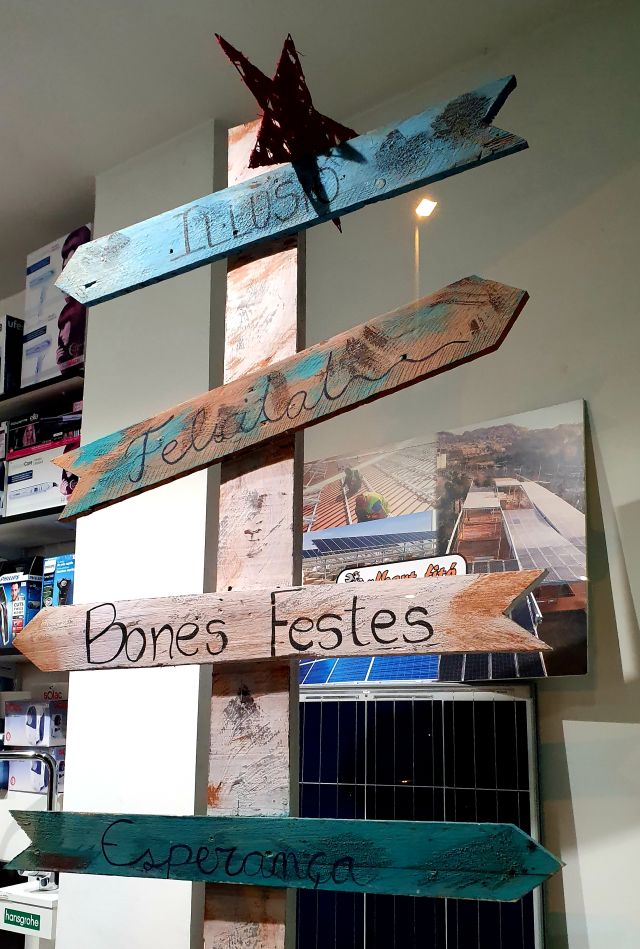 La tenda d’electricitat i suministres Pallargues ens donava una lliçó de decoració en clau manual. Aquests bons desitjos…