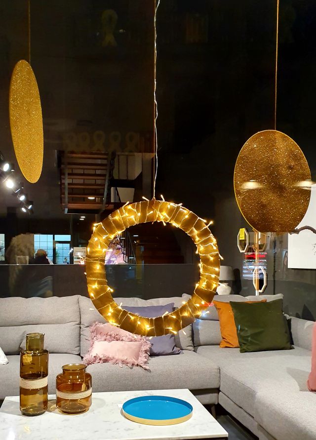 Cervera Mobiliari. Em va agadar molt la decoració feta manualment, especialment, el detall del mig. Retallant la forma amb un cartró, s’hi posa pintura daurada i s’hi emboliquen unes llums. Quedava molt bonic!