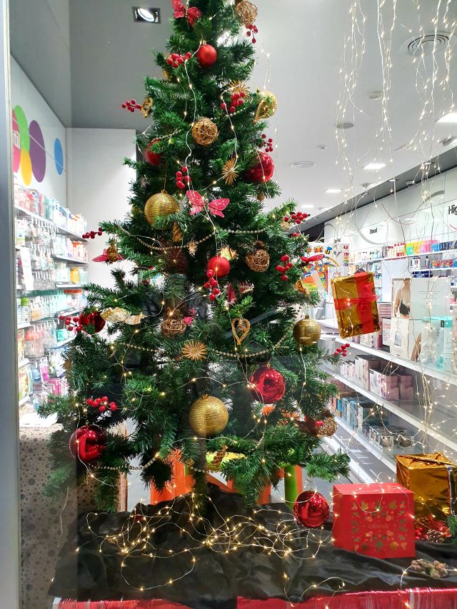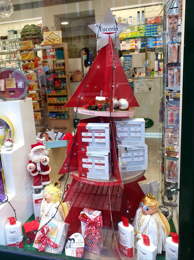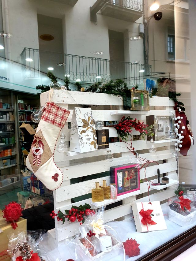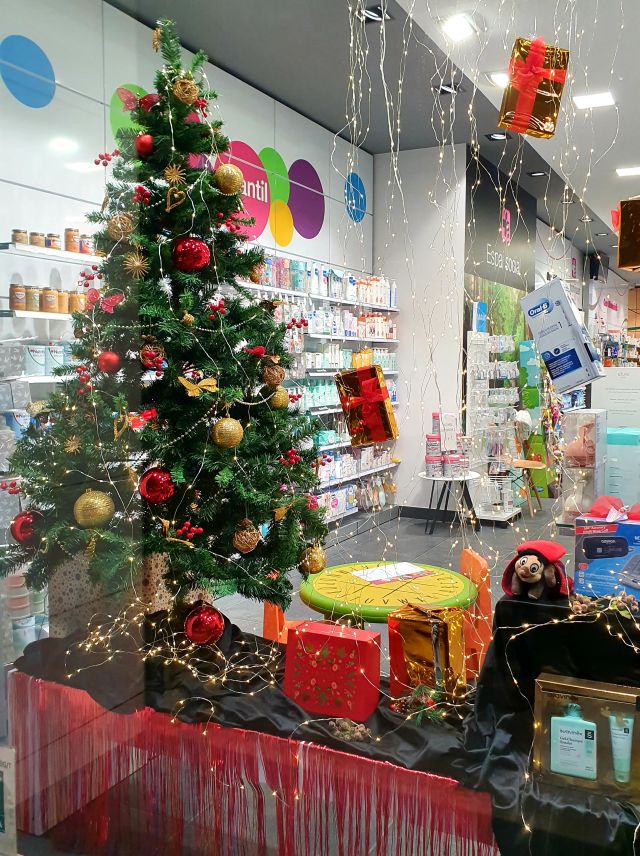 Farmàcia Martorell. Decoració nadalenca combinada amb un seguit de productes de parafarmàcia molt adients per regalar en aquestes dates.