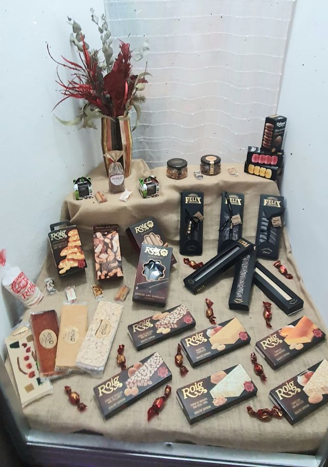 Supermercat Gomá. Un ram fet amb plantes de temporada vigila una exposició de torrons, el producte estrella associat al Nadal.