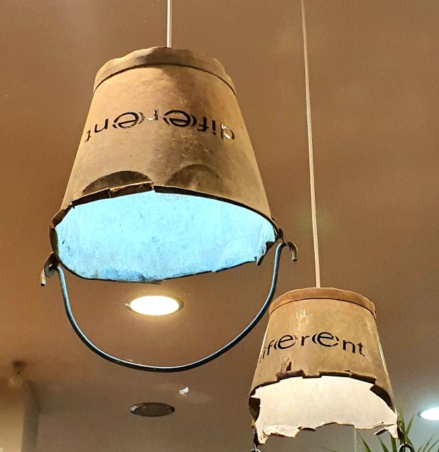 En l’aparador de festes han fet servir dues galledes invertides a mode de pantalla. Una idea ben original.
