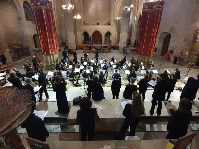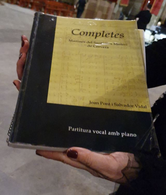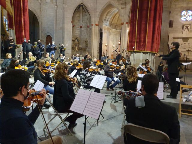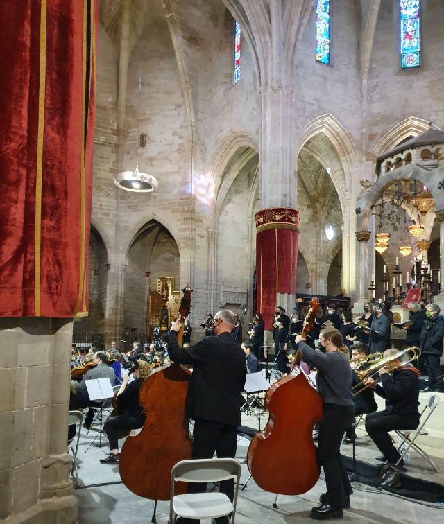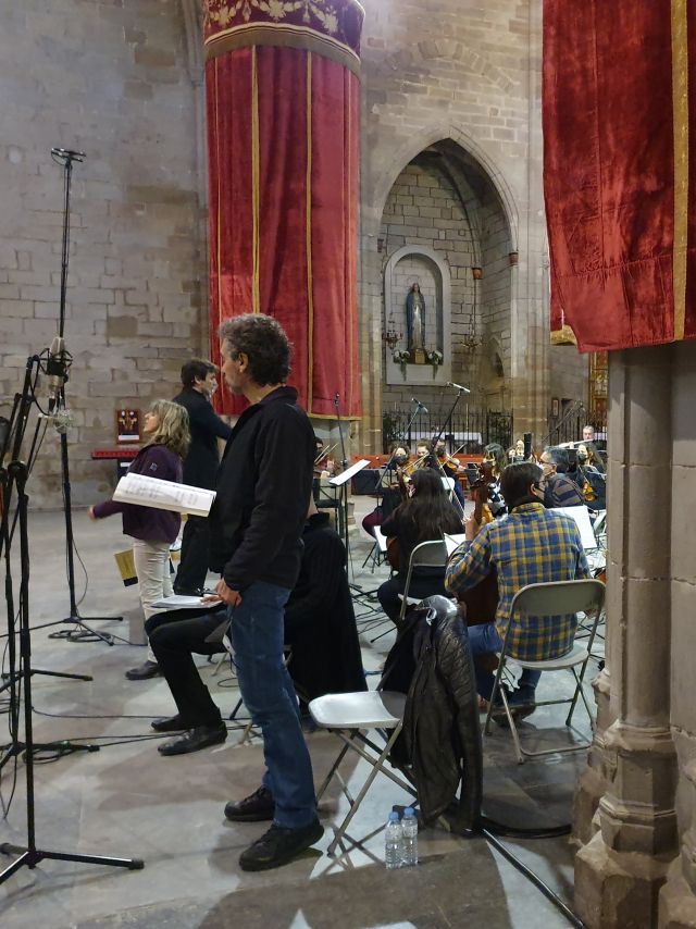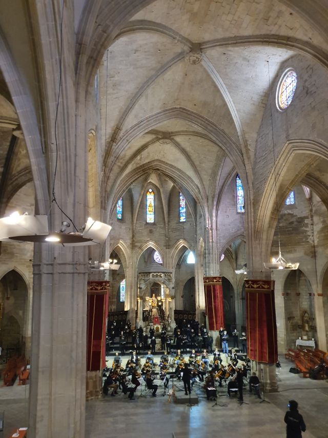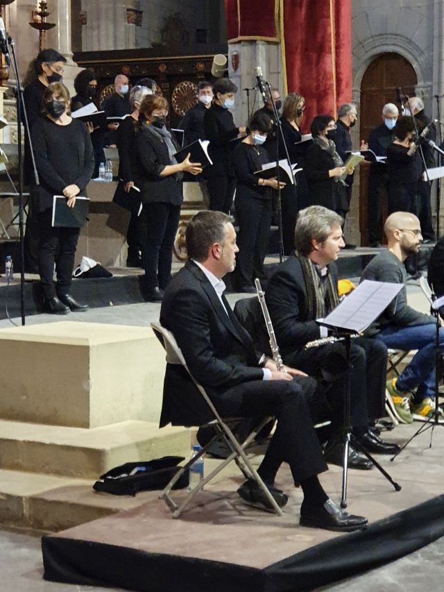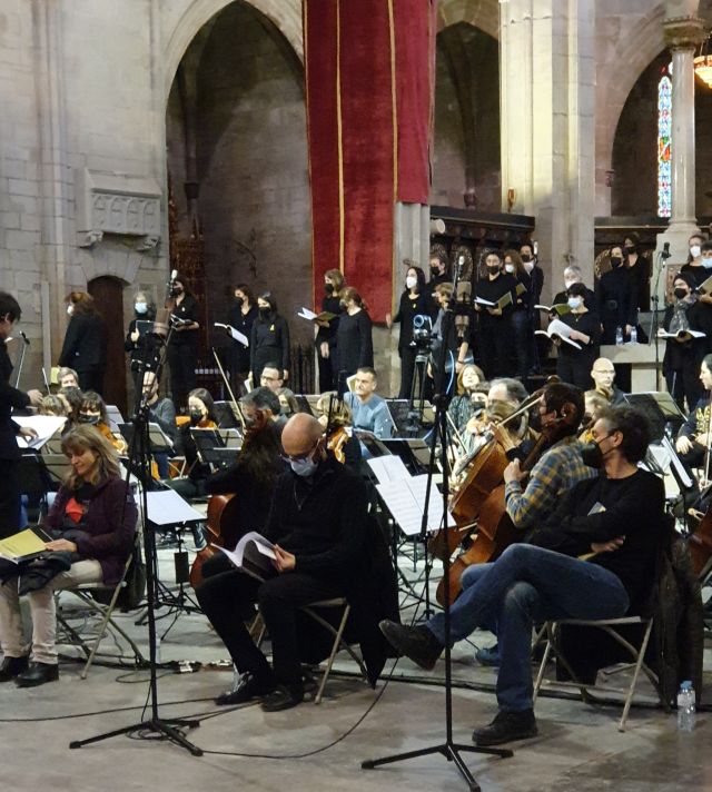 Aquesta fotografia ens fa adonar del gran canvi que suposa l’edició d’enguany amb la d’altres anys. Els cantants ben separats, el seu nombre reduït, els músics col·locats a un lloc no habitual i Santa Maria, buida. Res a veure amb les imatges que tenim en el record.