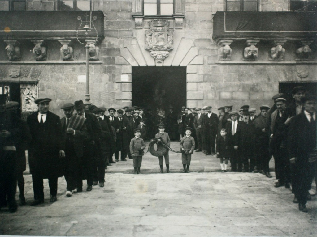Els tres nens encarregats de portar la corona que dipositaran al peu del monument surten de l’Ajuntament acompanyats de tots els participanta a la processó.