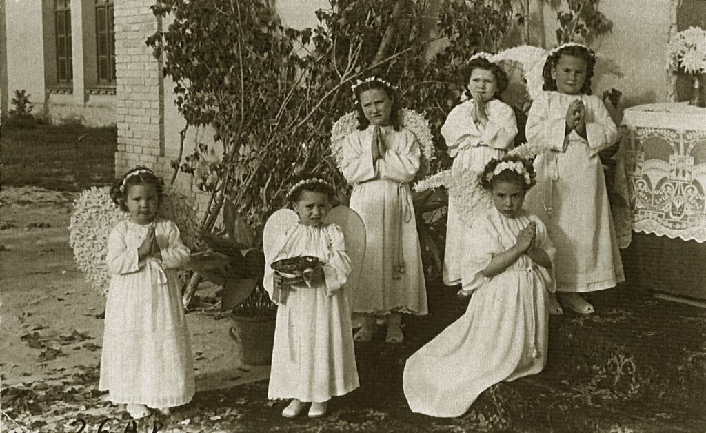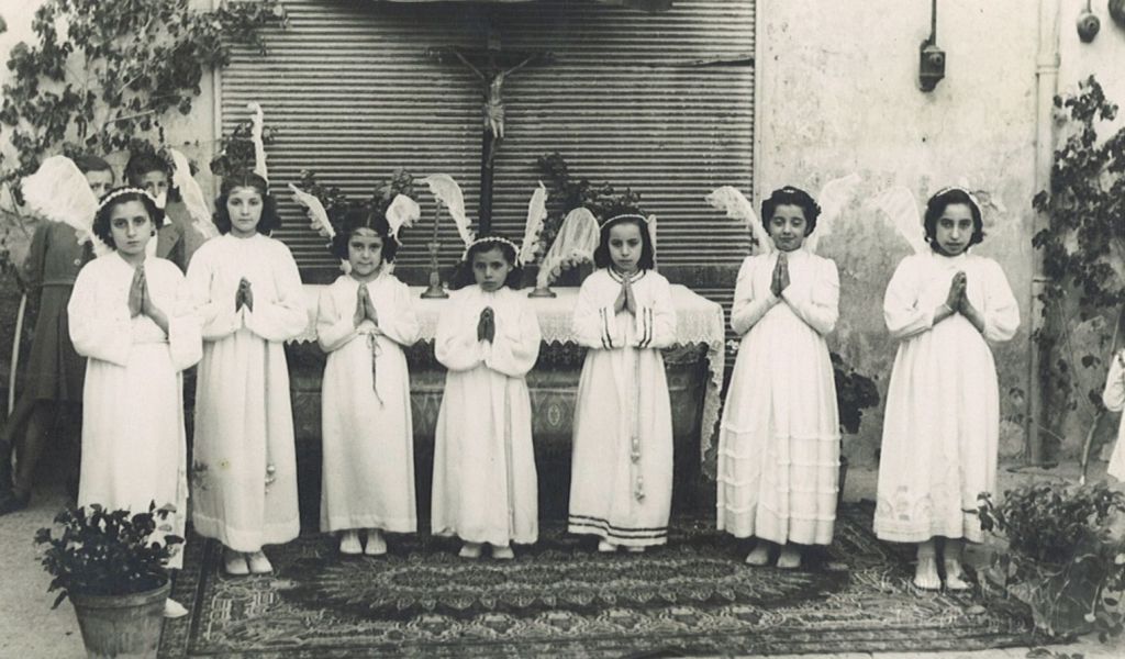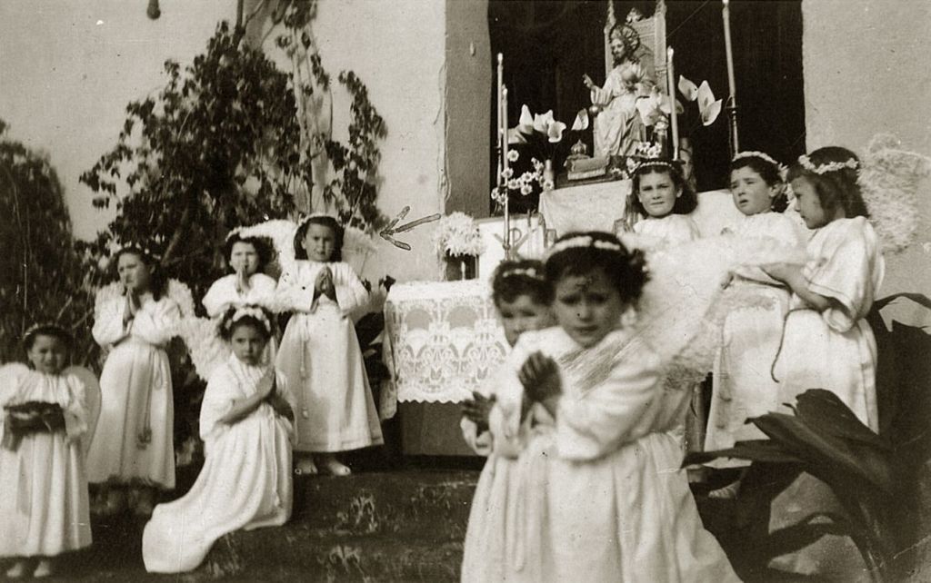Un grup d’angelets que es preparen per anar a un dels altars que es feien en motiu de la Processó de Corpus. Estan al carrer combat davant “cal Comas”. Els tres angelets de la dreta són: la filla de la casa, Carme Comas, Dolors Domá i Dolors Vendrell
