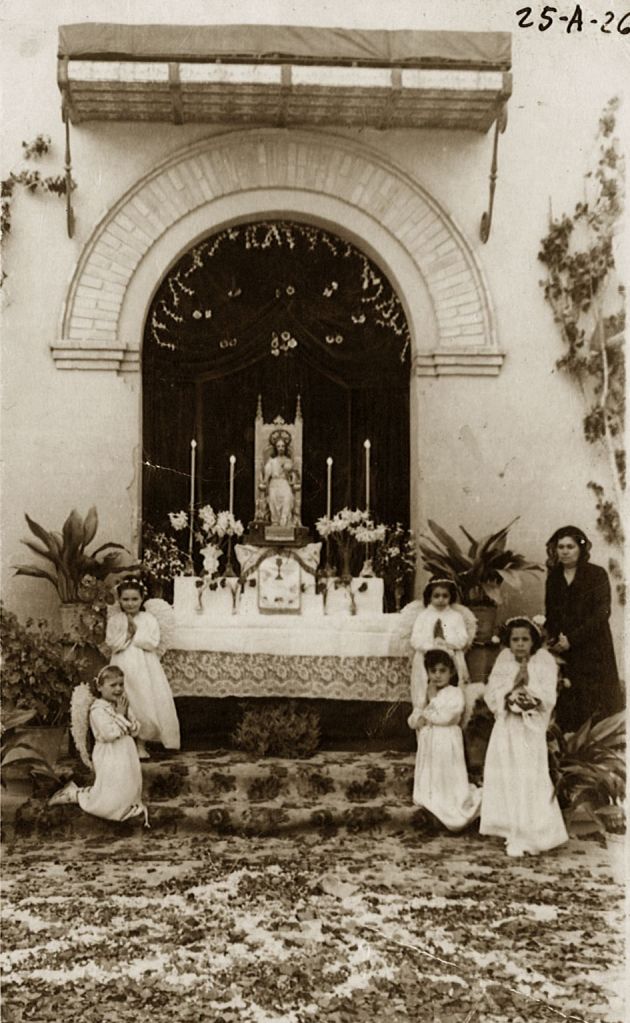A la porta d’entrada del Col·legi Jaume Balmes, tradicionalment s’hi feia u d’aquests altars. Sempre hi havia nenes vestides d’angelet. Dues del darrere estan identificades. D’esquerra a dreta: Josefina Roselló, traspassada fa uns anys, del forn de pa que hi havia davant l’església del Cor de Maria al carrer Major i Conxita Roselló que va tenir cura molts anys de la “Llibreria Académica”.