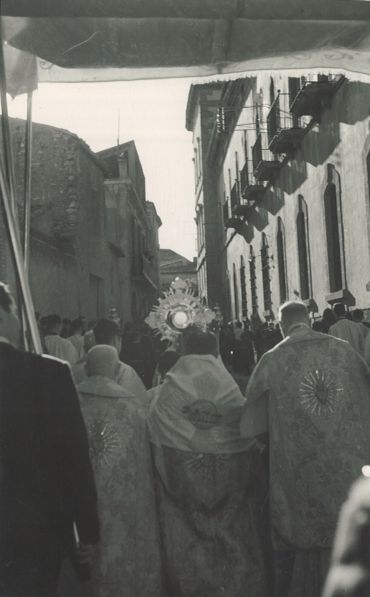 Són molts els capellans que hi havia en aquells temps que van desfilant amb els angelets al centre. Al continuació, el tàlem amb la custòdia i, al darrera, tancant la processó, els macers i les autoritats.
