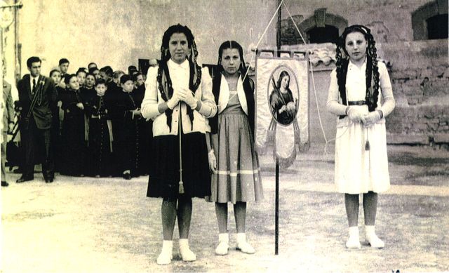 Portant el pendó, d’esquerra a dreta hi ha: M. Dolors Tarsá que despatxava a la botiga de “ca l’Alsinella” que estava just davant de “cal Birlota” al carrer Combat. En aquest espai avui hi ha la fruiteria Huguet. Tarsá es va casar amb el pintor Viñuela . Més endavant van comprar la casa de “cal Trompetín” al carrer Major, tocant al carreró de les Bruixes. És el lloc on molts anys hi tenia la botiga el Rogelio lampista. Al vestibul de la Paeria, al primer pis, hi ha uns quadres magnífics de diferents racons de Cervera, que va pintar el seu marit. Ella ja fa uns quants anys que va morir.
