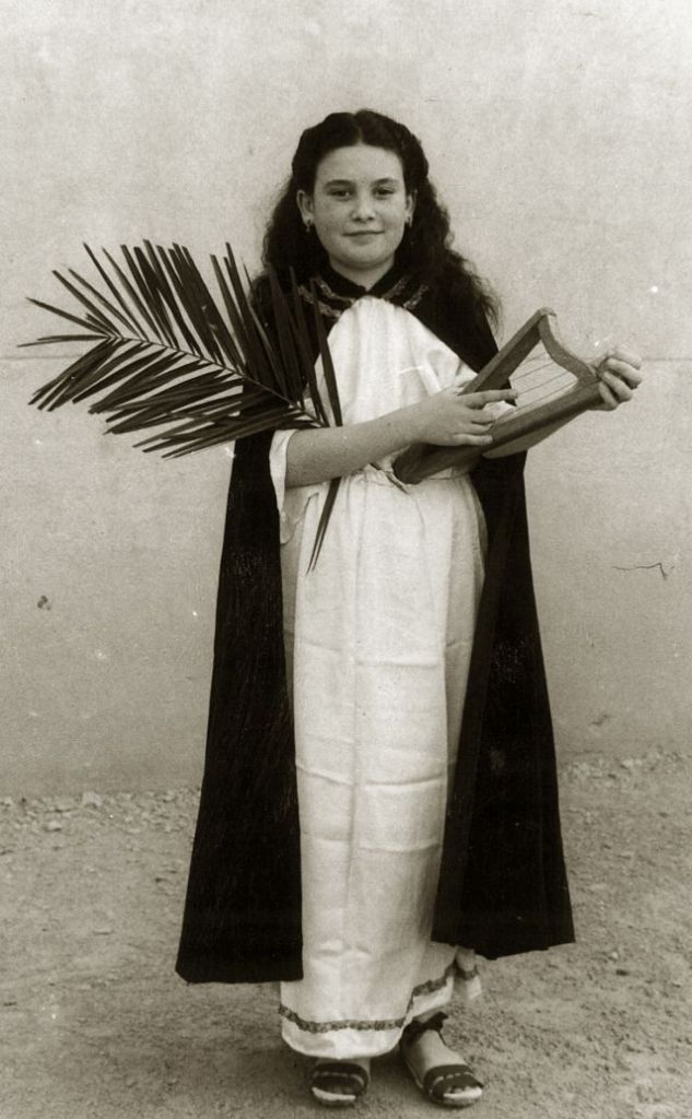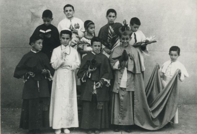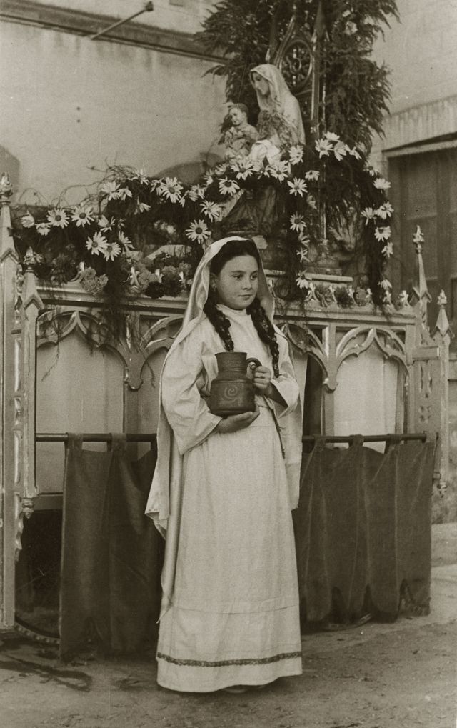 Aquesta fotografia és una mica fosca però es veuen bé tots els que hi surten. És la que es feien de grup tota la colla que participava a la processó. A l’esquerra es veu Nuri Riera que sembla interpreta la Verge de Fàtima ja que té els dos pastorets agenollats al seu costat.