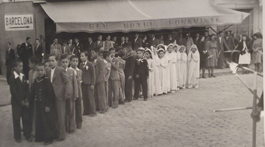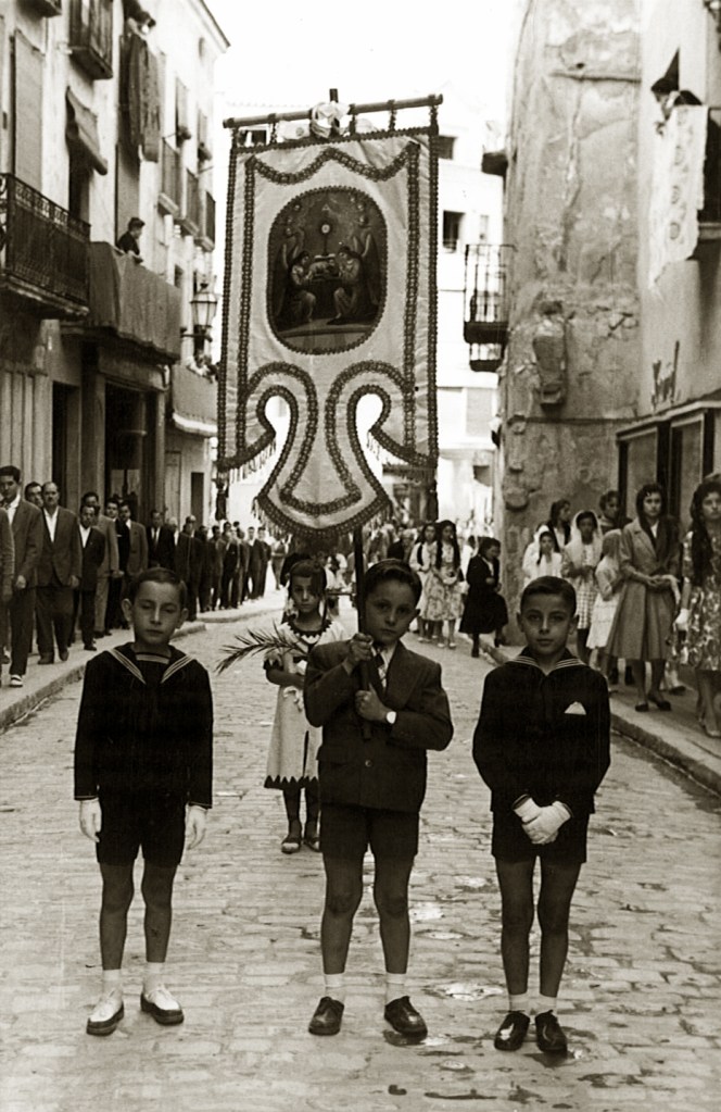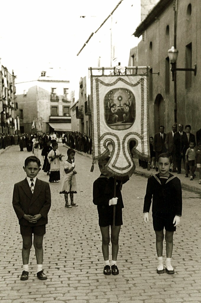 Aquí els tornem a veure amb els llocs canviats. La processó passa per l’entrada al carrer Major i es veu com era l’edifici on hi hagué durant molts anys “Magatzems Pilar” i que va quedar completament renovat. També es veu bé alguns dels i les assistents. Els homes i nens caminen per un costat de la vorera, sense ni ciris ni atxes i, les dones i nenes, a l’altre. El primer nen que va darrera del pendó és Salvador Puig Torres.