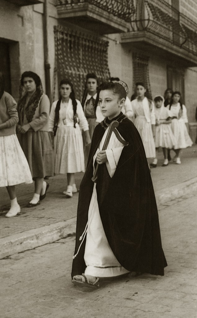 Maria Rosa Villarroya Massana va vestida de Santa Cecília, patrona de la música. La processó passa per davant de ca Lafargue. Observeu el detall de les mantellines que porten les dones i noies, que són de color negre. En canvi, les nenes, les porten de color blanc.