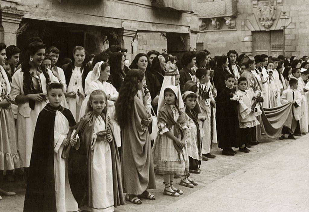 Seguim amb la processó del Cor de Maria tot i que amb la primera fotografia tinc un dubte. De fet és a l’Arxiu Comarcal de Cervera i està classificada com que pertany a aquesta processó. Jo tinc alguns dubtes perquè, en principi els nens i nenes de Primera Comunió crec que no hi anaven i, a més es veu tot una filera d’homes que porten ciris o atxes i, això era propi de la processó de Corpus. Però també s’hi veuen algunes dones. En fi queda el dubte.