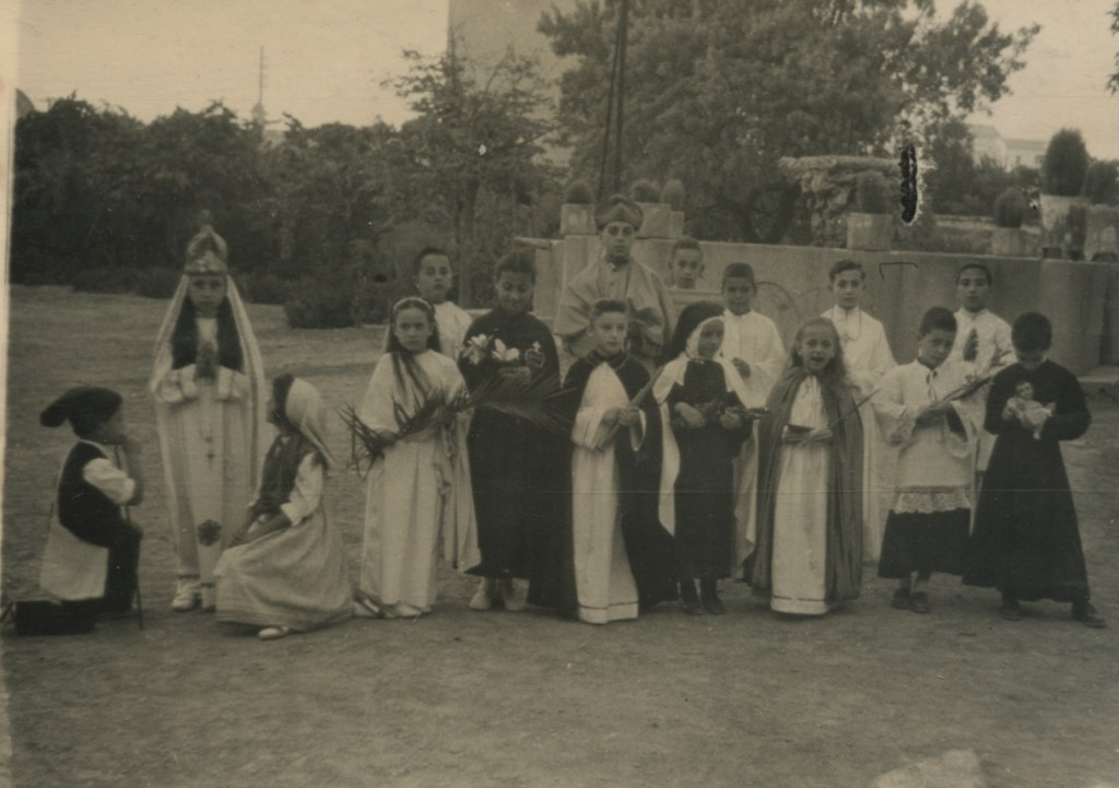 Al seu darrere hi tenen, davant la columna, Nuri Xandri del forns de pa de “cal Xandri”. La que porta l’arracada blanca és Nuri Rius i la de l’escapulari Carme Calafell de “ca la Mundeta Corder”. Entre les dues germanes Colom s’hi veu l’Adelina.