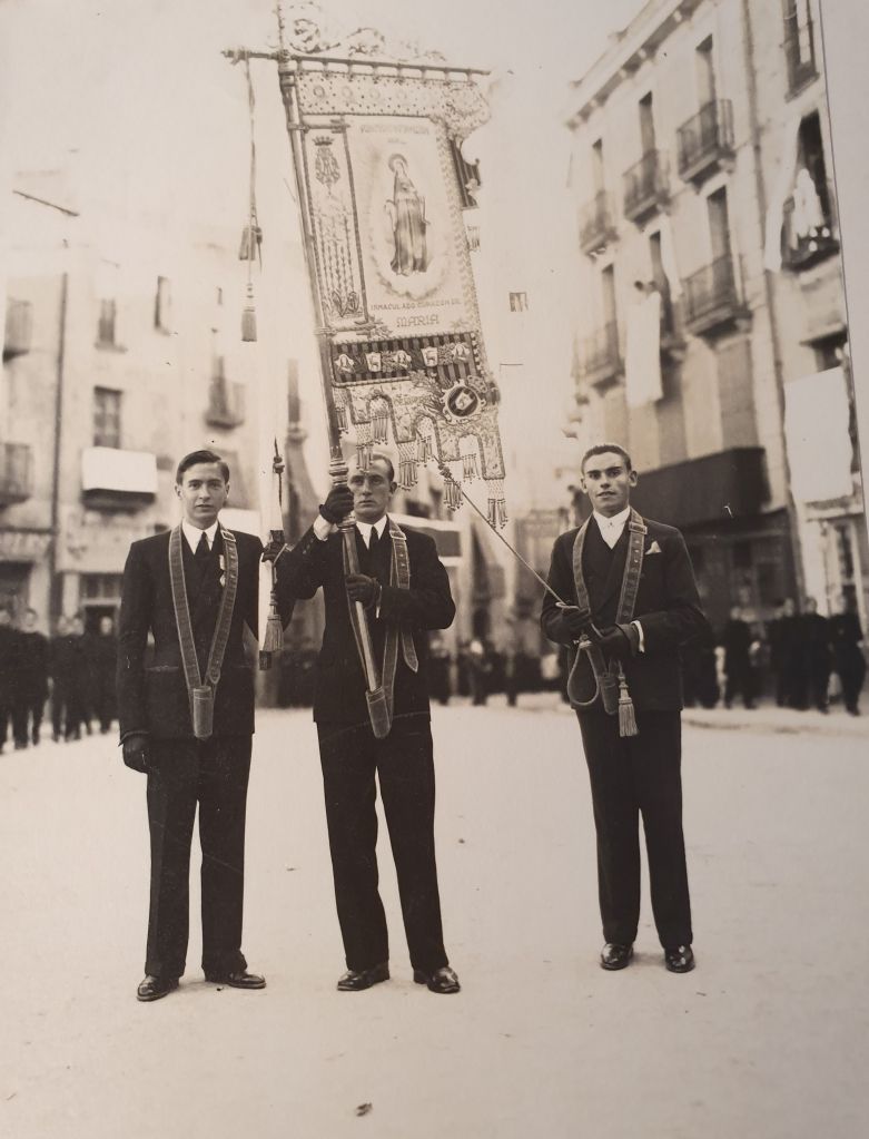 En aquesta fotografia es veu un dels pendons que portaven a la processó. Està feta a la plaça sant Miquel i els portants estan tots identificats. En breu s’hi posarem els seus noms.