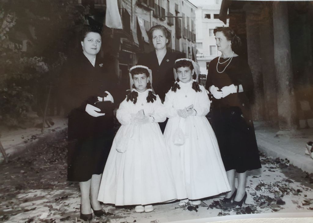 Les Primeres Comunions es feien abans de la festa de Corpus i, era tradició que els nens i nenes que havien fet la Primera Comunió, anessin a aquesta processó. Podem veure les nenes Dolors i Misteri Rivera Raich, altra volta amb els magnífics tirabuixons, aquí acompanyades per la seva mare Ramona Raich, per la seva tieta Emilia Rivera i una altra persona de la família, posen al principi del carrer Major en la Diada de Corpus. Com podeu veure el terra està encatifat i a la vorera hi ha enramades. La gent, el dia de Corpus, es mudava al màxim. Aquestes senyores vesteixen molt elegants.