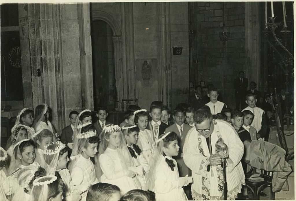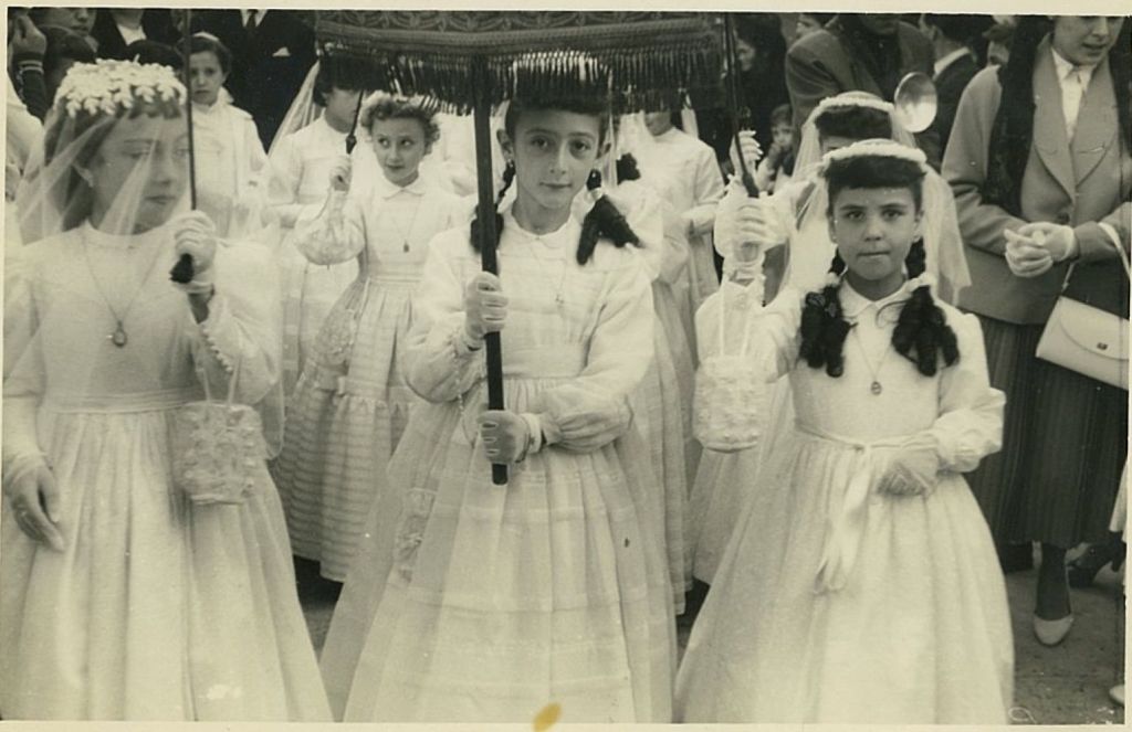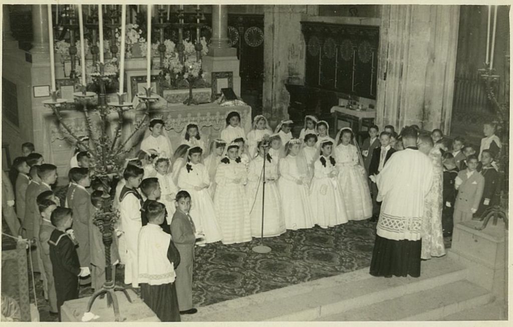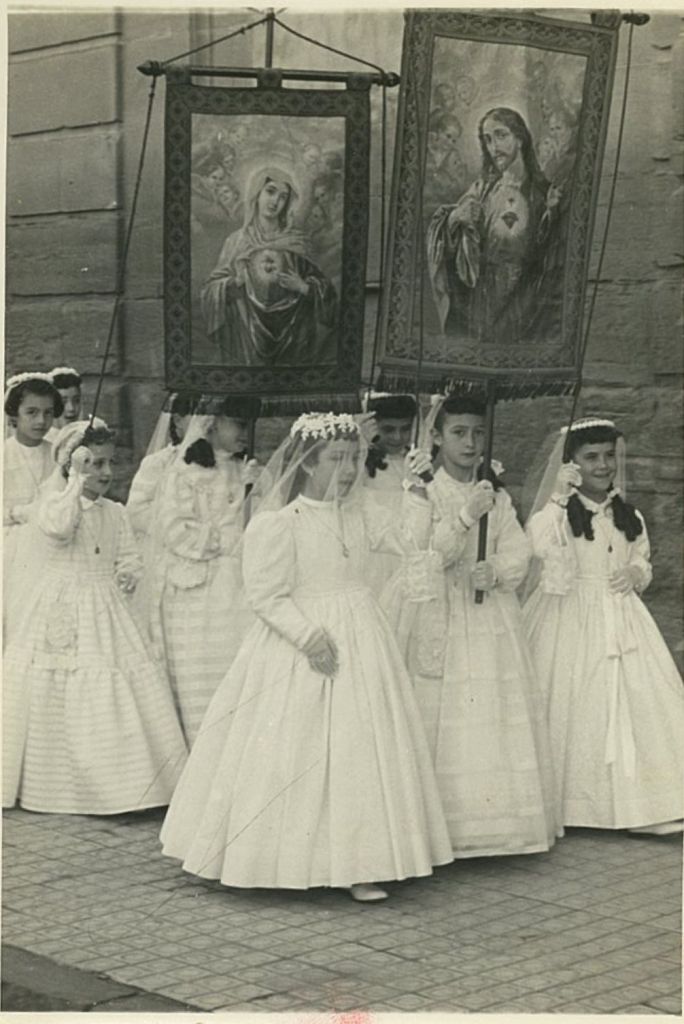 A continuació podreu veure la Processó de Primera Comunió que ja s’ha explicat que es feia des de Sant Antoni fins a Santa Maria i, els nens i nenes, que n’eren els únics protagonistes, portaven pendons. Portar-lo volia dir que havien estat els i les alumnes que s’havien mostrat més aplicats en el temps de la catequesi, que era la instrucció que es rebia abans de fer la Primera Comunió.